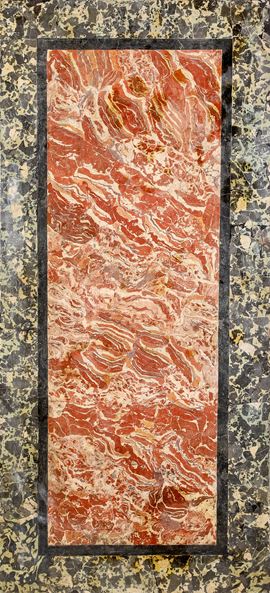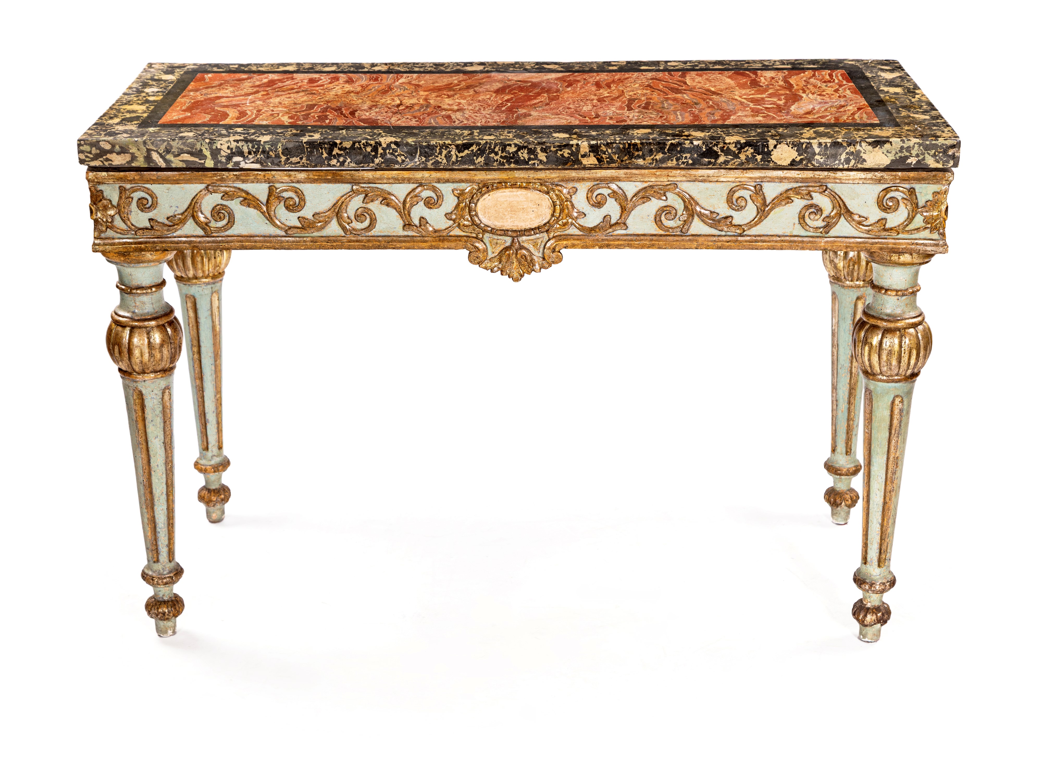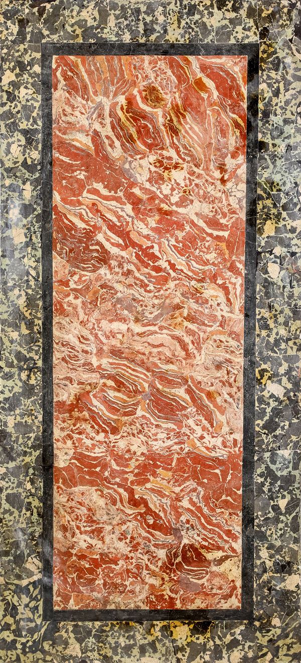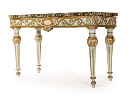 piano rettangolare in scagliola decorata ad imitazione dei marmi rosso e nero, fascia centrata da un medaglione ovale privo di ornamenti, da cui si dipartono steli curvilinei animati da rilievi vegetali. Gambe rastremate scanalate con attacchi a rocchetto su bulbo baccellato e dorato
