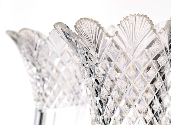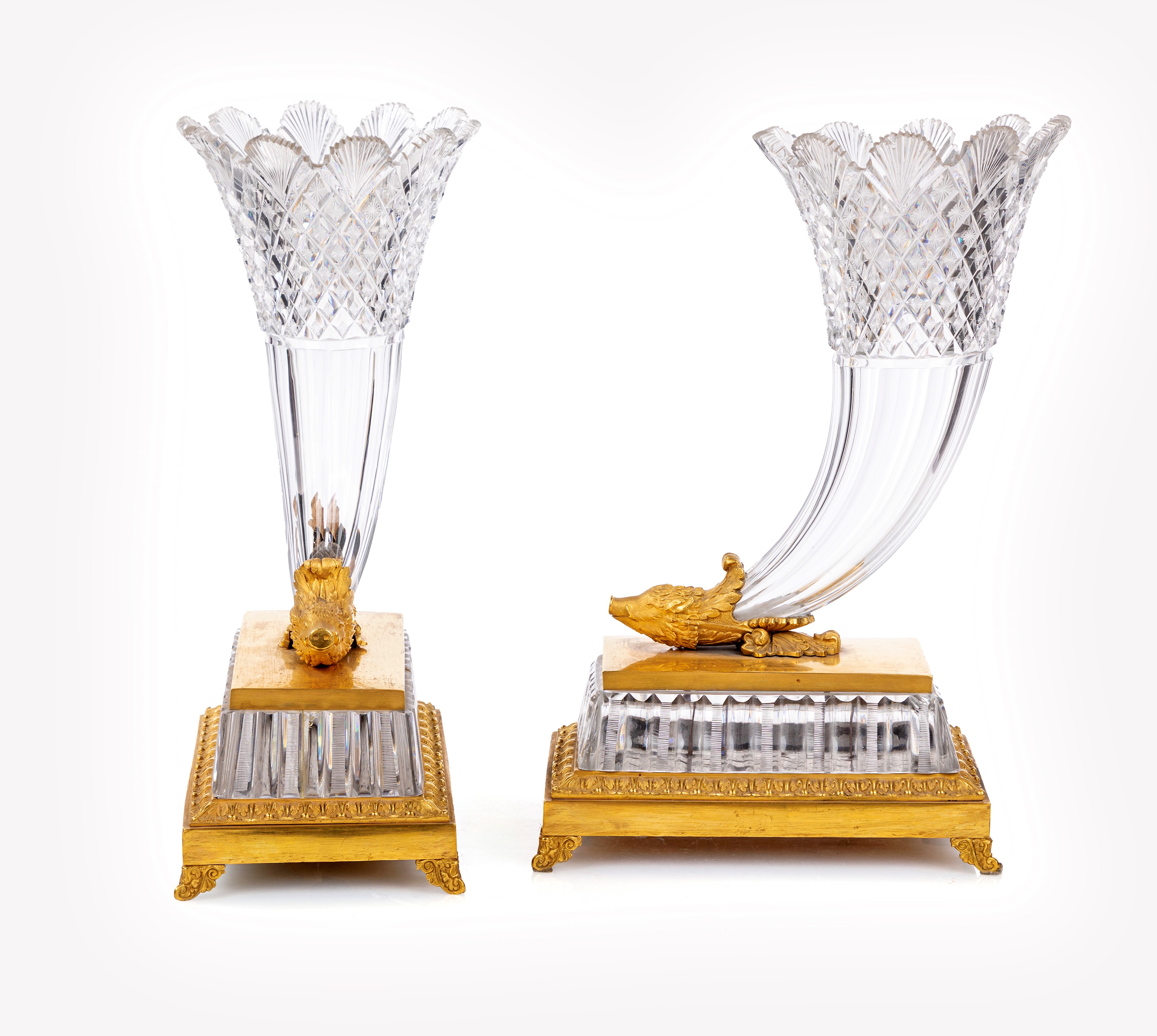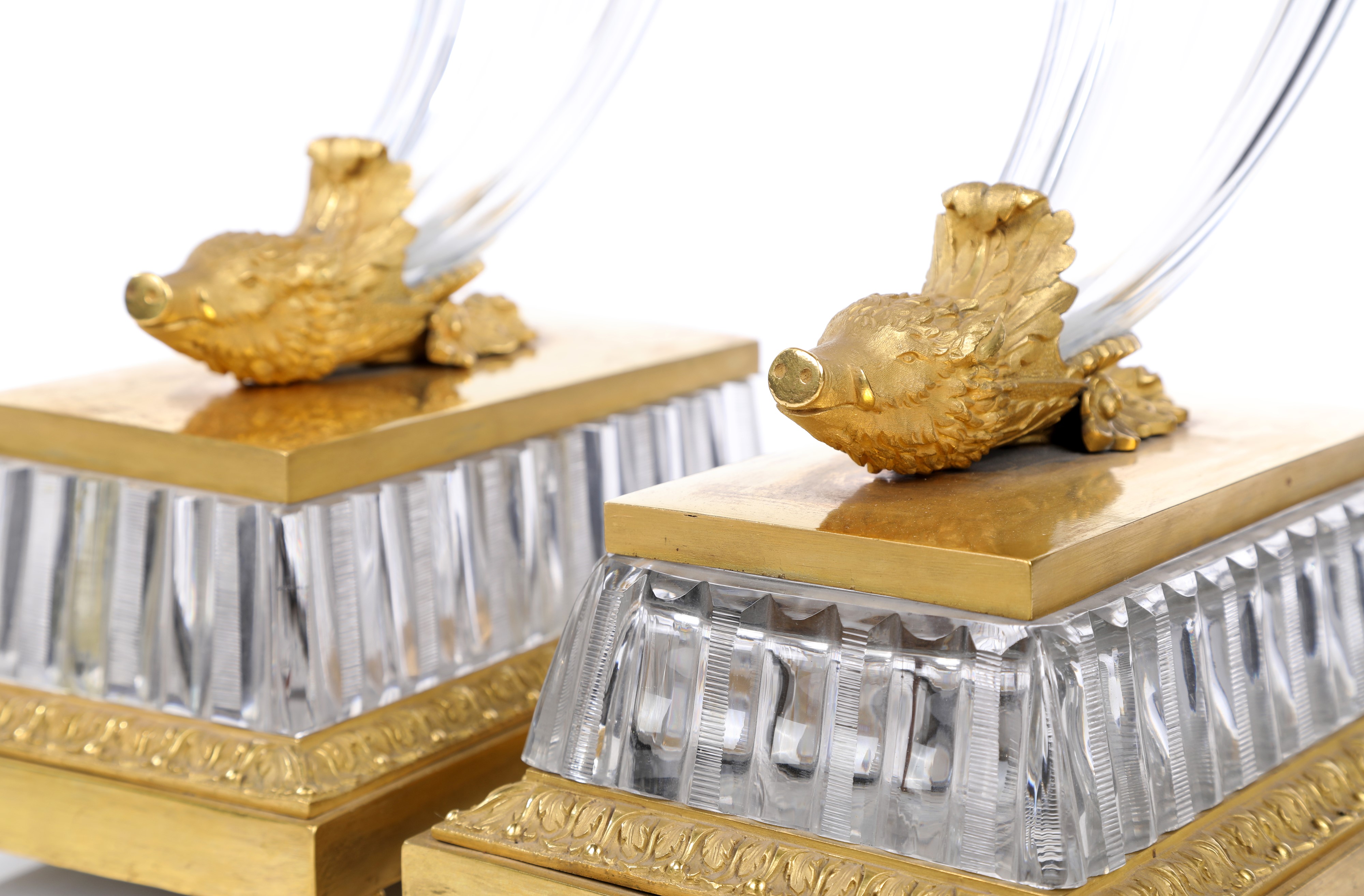 emergenti da una testa di cinghiale finemente cesellata, recano parte superiore con tagli geometrici e sfaccettati, imboccatura svasata e orlo a palmette; basi architettoniche in cristallo e bronzo dorato, con piedi angolari e cornici modanate
