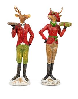 Coppia di figure zoomorfe reggicandela in poliresina policroma (cervi in abiti da servitore)
