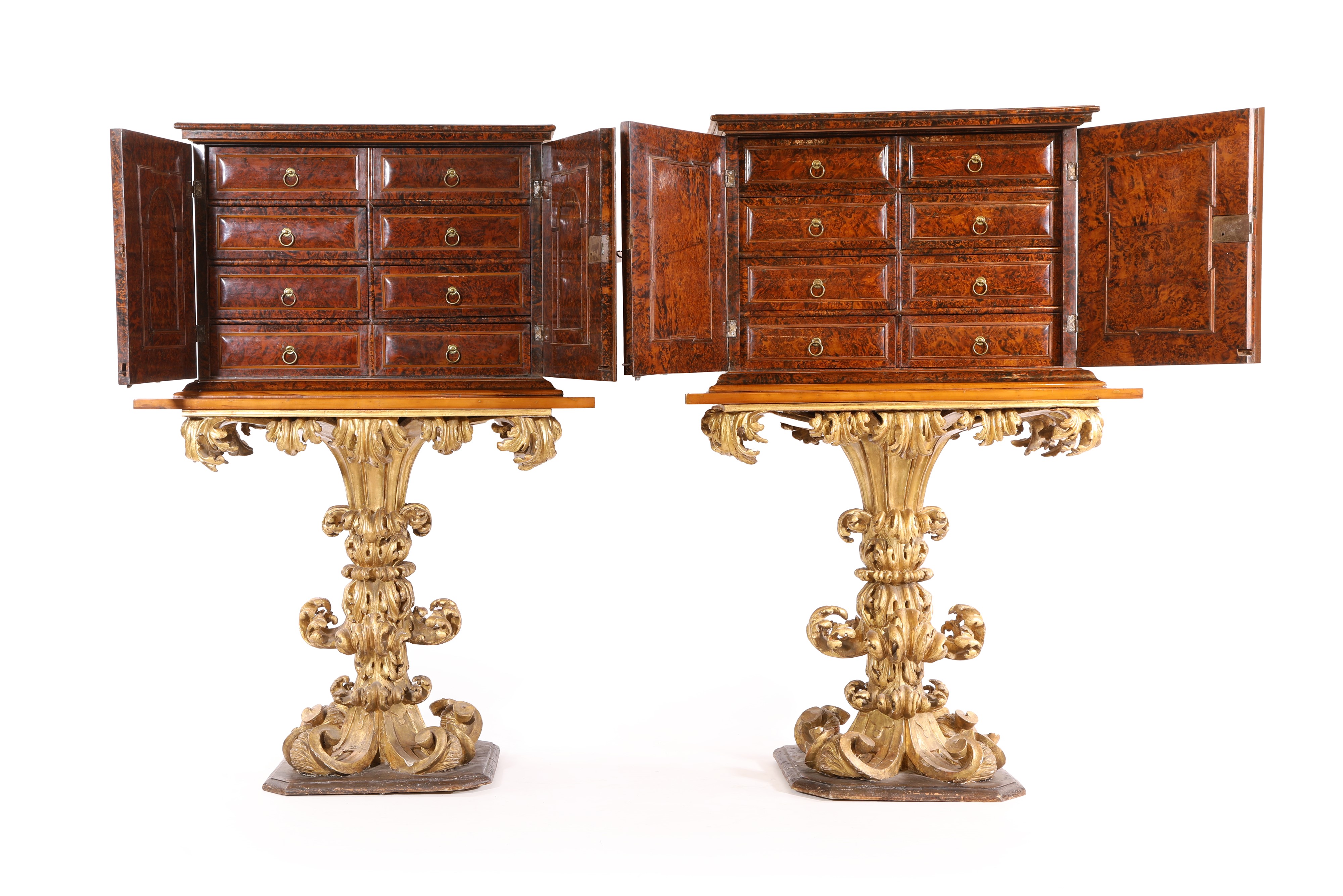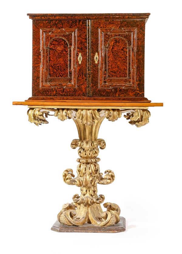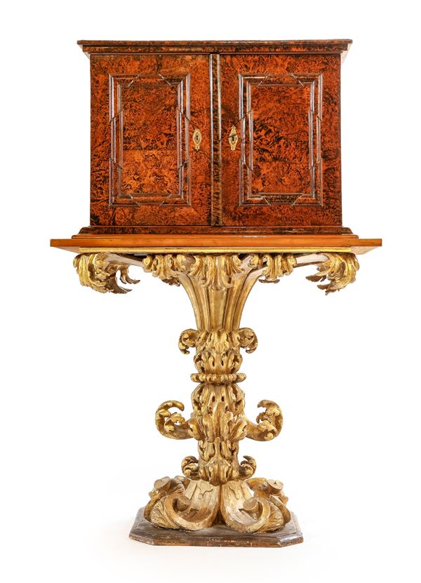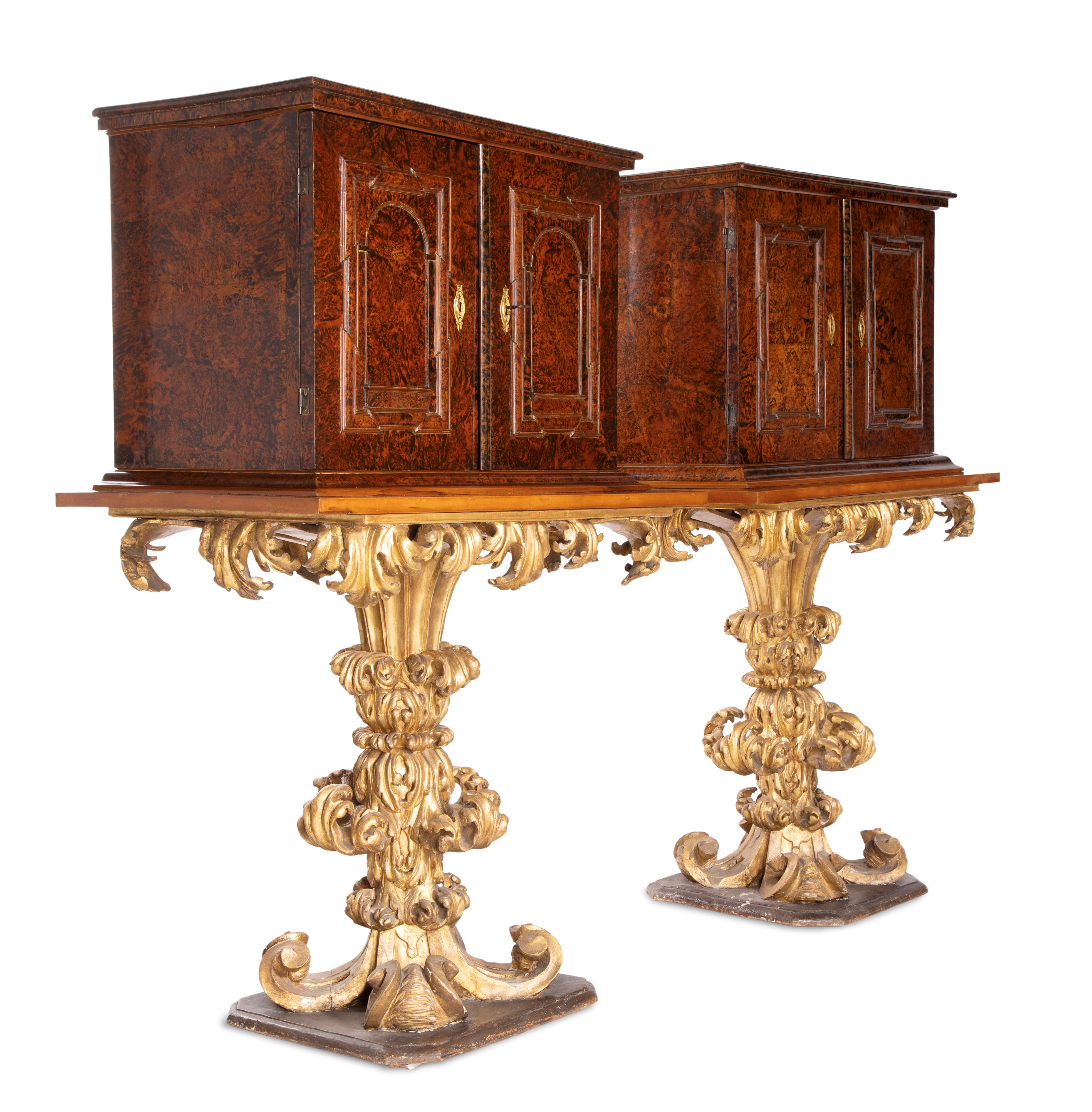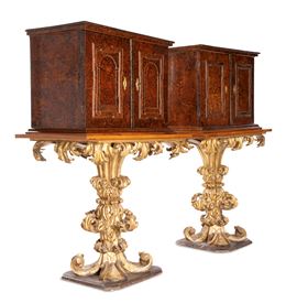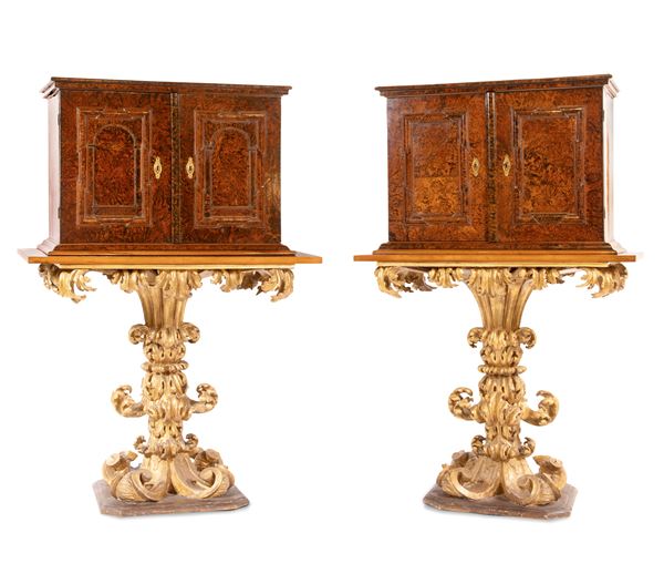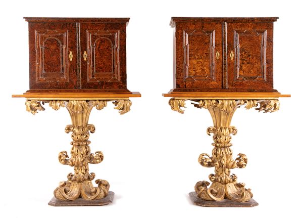Coppia di monetieri lastronati in radica di sicomoro, su base scolpita in legno dorato, Roma, XVII secolo