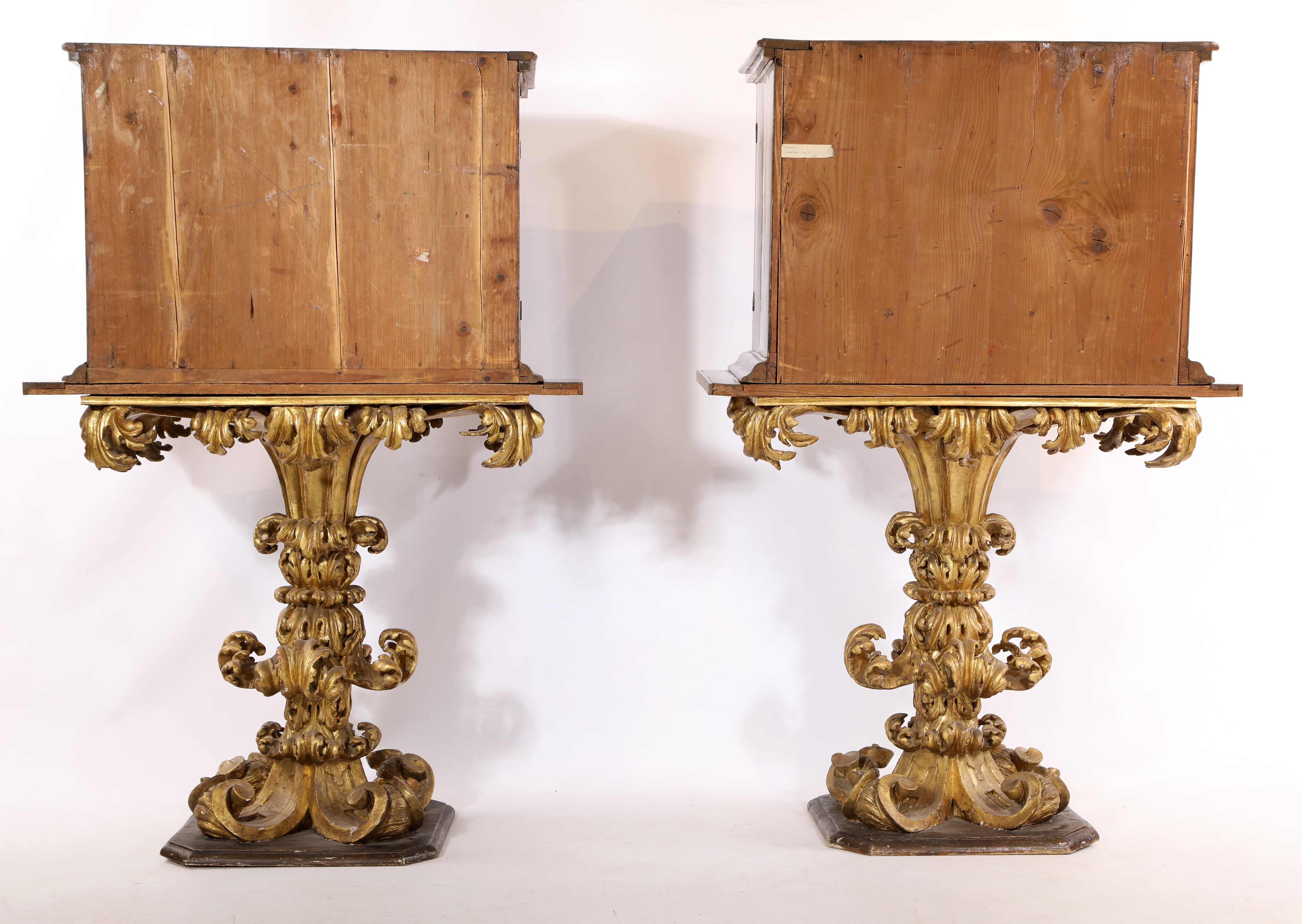 corpo parallelepipedo in radica disposta a macchie speculari, ognuno con due ante frontali che si differenziano nel riquadro centrale, centinato in un esemplare e squadrato nell'altro. All'interno sei cassetti con pannelli incorniciati a simulare otto tiretti disposti in colonna su coppie affiancate. Entrambe poggiano su uno scenografico piedistallo in legno scolpito ed intagliato a tutto tondo e dorato in forma di cespo con foglie d'acanto fortemente incurvate derivanti dal repertorio berniniano e post-berniniano, tipico delle botteghe romane tra fine Seicento e primo Settecento.