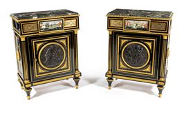 Coppia di piccole credenze in legno ebanizzato con ricca ornamentazione di bronzi e placche in commesso di marmi, attribuibili ad Adam Weisweiler, Francia, fine del XVIII secolo