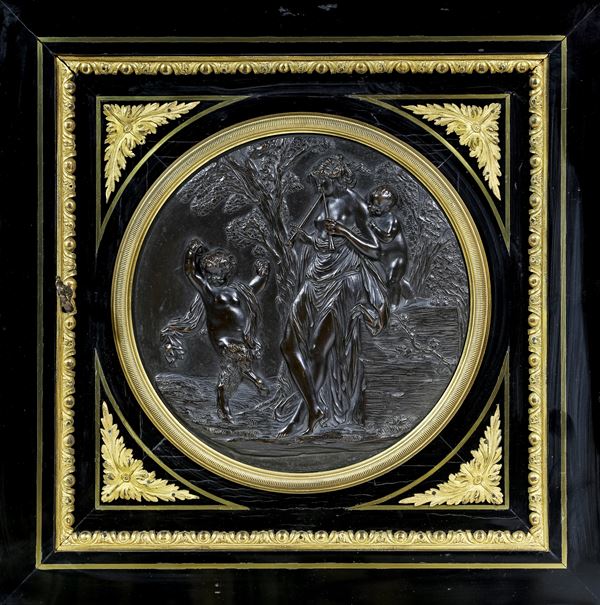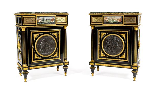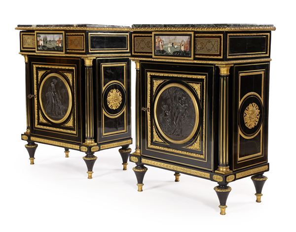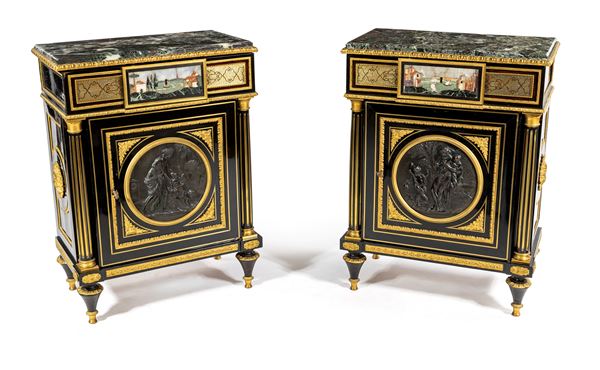 Struttura architettonica rifinita superiormente da piano in marmo verde, ognuna reca fascia decorata da incrostazioni alla maniera di Boulle, centrata da un cassetto con placca musiva raffigurante una veduta paesaggistica con architetture classiche provenienti dalle officine granducali fiorentine. La facciata di ciascun mobile reca uno sportello centrato da un ampio medaglione circolare in bronzo brunito raffigurante rispettivamente una ninfa che suona una doppia zampogna, con un bimbo alle sue spalle, ad un satiro bambino che danza e suona le nacchere, ed una baccante con Dioniso bambino che cavalca un giovane fauno, entrambe da Claude Michel Clodion (Nancy 1738 - Parigi 1814). I soggetti, differenti ma coerenti, sono concepiti in modo complementare e pensati per dialogare visivamente secondo il principio del pendant. Colonne angolari scanalate con manicotti in bronzo dorato, piedi troncoconici con terminali dorati.