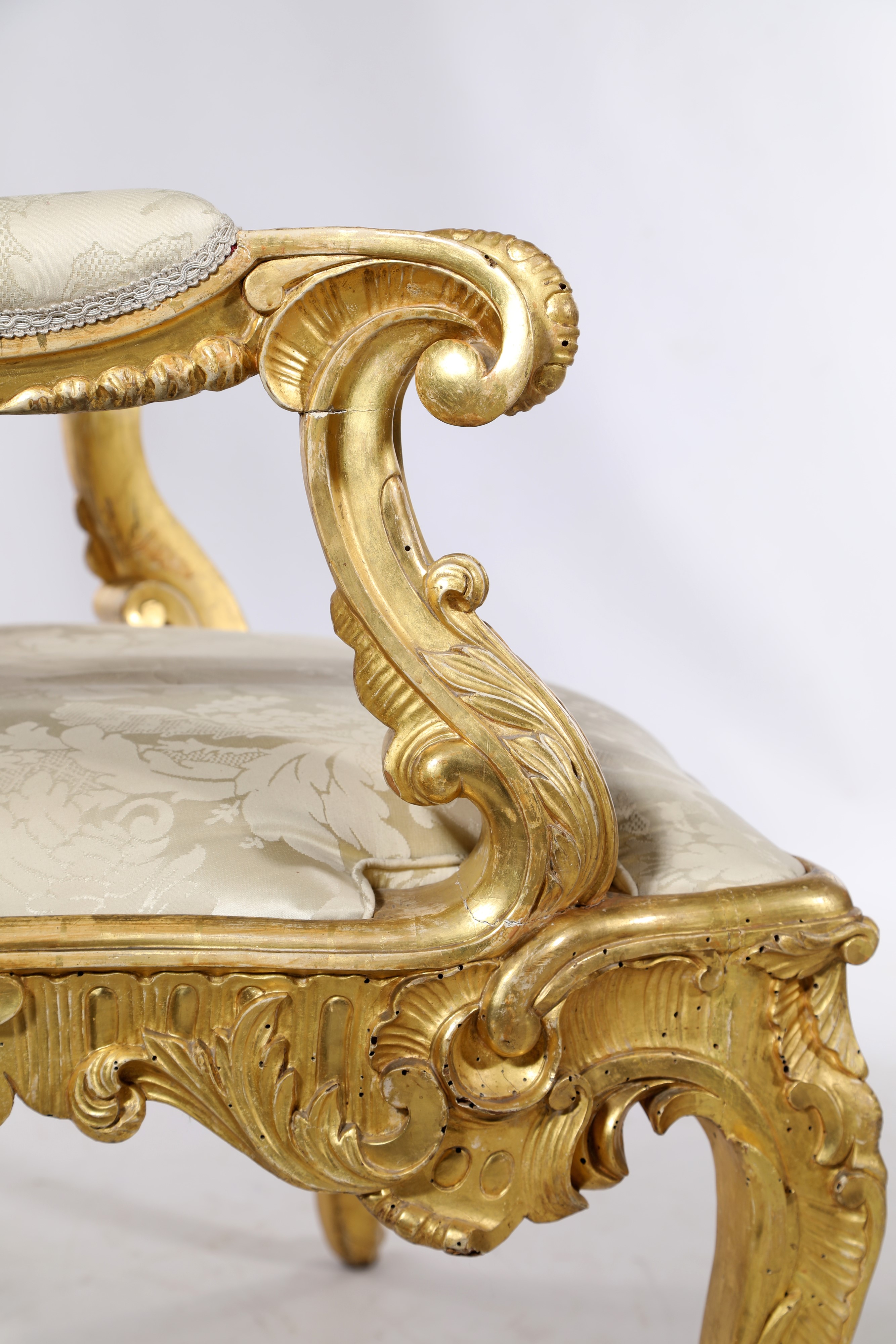 cornici sagomate caratterizzate da lambrecchini su cui si posano volute e foglie; cartigli asimmetrici dominano la sommità dello schienale mentre conchiglie sono poste come elemento decorativo mediano della fascia sotto sedile. Schienale e seduta imbottiti e rivestiti in tessuto damascato; braccioli terminanti a ricciolo, gambe mosse