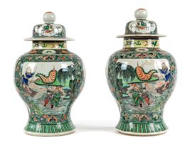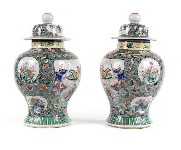 Coppia di potiches in porcellana Famiglia Verde, Cina dinastia Qing, epoca Guangxu, fine del XVIII/inizi del XIX secolo