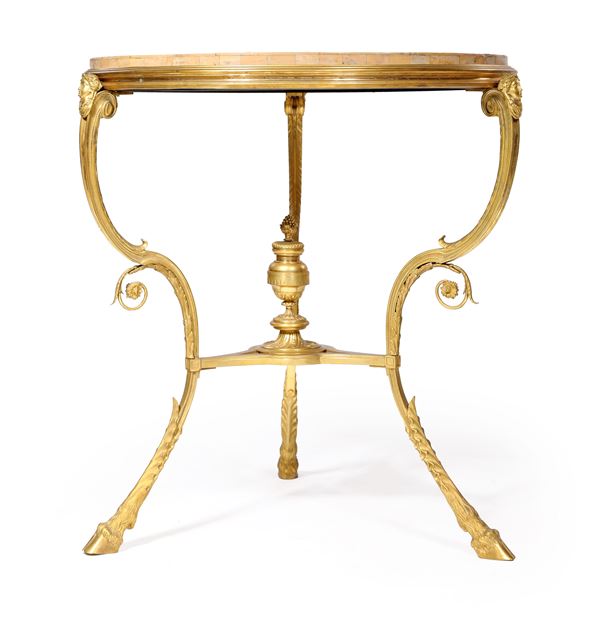 Coppia di tavolini in bronzo dorato con piano circolare in commesso geometrico di marmi rari, opera di Stefano Atticciati, fine del XVIII secolo