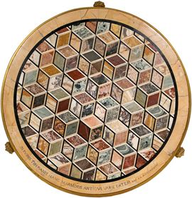Piani in marmi antichi con iscrizione latina attestante la provenienza da rovine romane di età tiberiana e data 1788, caratterizzati da una raffinata varietà cromatica ottenuta mediante il reimpiego di materiale antico, inseriti in un telaio lineare sorretto da tre gambe incurvate terminanti a zoccolo caprino, abbellite all'attaccatura da mascheroni classici e riunite fra loro da una traversa sormontata da un vaso. Entrambe i piani recano, lungo il bordo esterno, un’iscrizione latina incisa, di gusto antiquario, volta a documentare la provenienza e la data di posa in opera: "In Rvinis Tiberianis Hanc Marmoris Antiqvi Varietatem S.A.F. A.D. MDCCLXXXVLIII". L’iscrizione, redatta con grafia arcaizzante (uso della V al posto della U), è da riferirsi a una pratica erudita tipica della seconda metà del XVIII secolo. L’espressione “In ruinis Tiberianis” indica la provenienza del marmo da rovine romane attribuite all’età dell’imperatore Tiberio, richiamando un contesto imperiale di alto prestigio. La formula “hanc marmoris antiqui varietatem” sottolinea il carattere antico del materiale, mentre la sigla S.A.F. è da interpretare non come “S(ua) A(uctoritate) F(ecit)” oppure “S(ibi) A(dsumptum) F(ecit)”, cioè [qualcuno] fece/realizzò ma come firma del marmista napoletano Stefano Atticciati. La data A.D. 1788 documenta l’anno di esecuzione del piano.