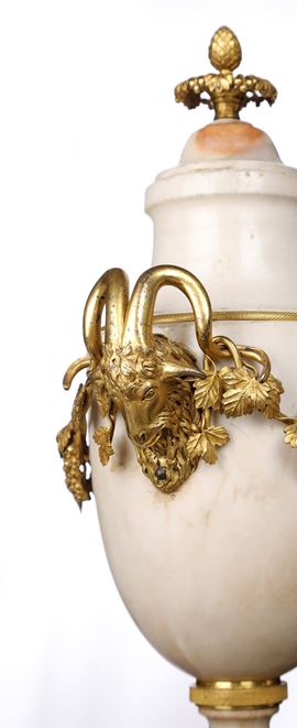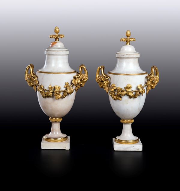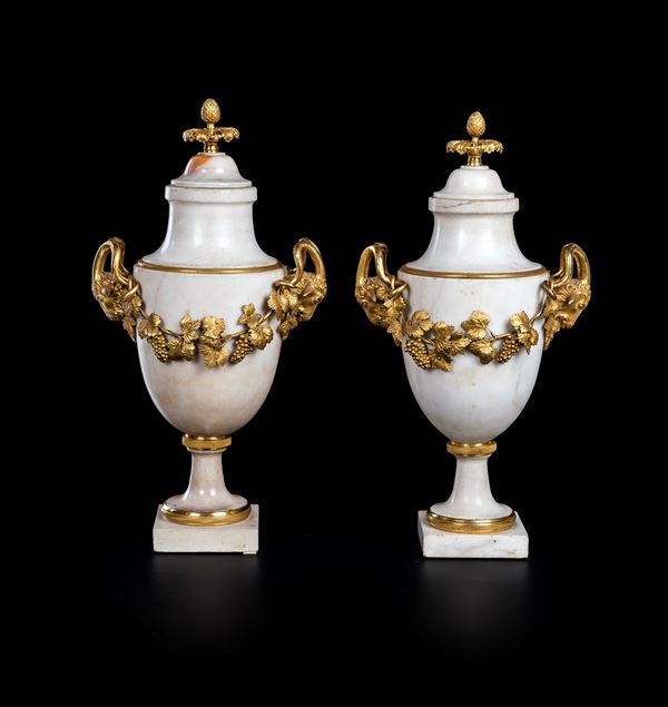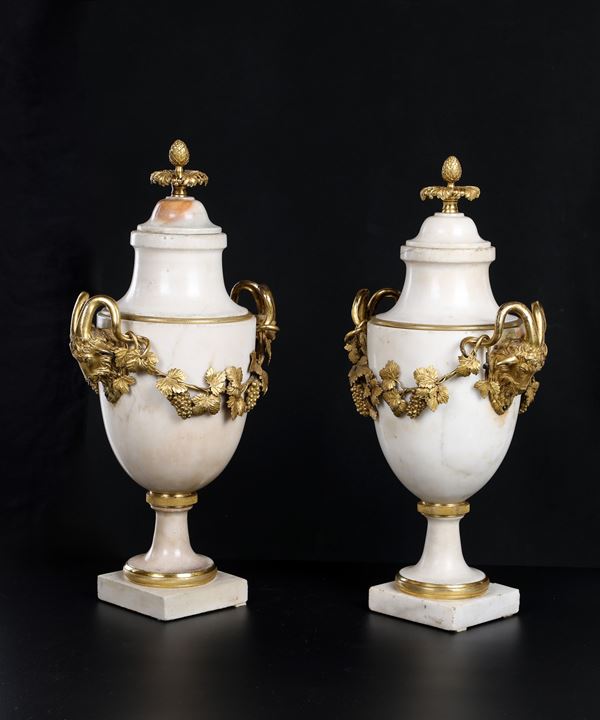 Coppia di vasi ad urna in marmo bianco e bronzo dorato d'epoca Luigi XVI