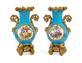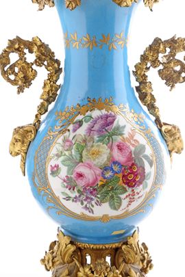 Questa coppia di vasi si colloca nella produzione francese ottocentesca di gusto neorococò, ispirata ai modelli della Manifattura di Sèvres del XVIII secolo, in particolare per l’uso del fondo turchese “bleu céleste”, le riserve figurate con amorini e la ricca doratura. Rispetto agli esemplari settecenteschi, le montature in bronzo dorato risultano più sviluppate e scenografiche, secondo un gusto tipico ottocentesco e della produzione parigina destinata all’arredo di rappresentanza.