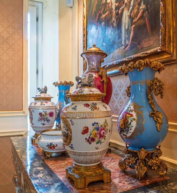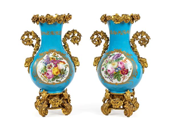 Coppia di vasi in porcellana di Sèvres e bronzo dorato, Francia, prima metà del XIX secolo