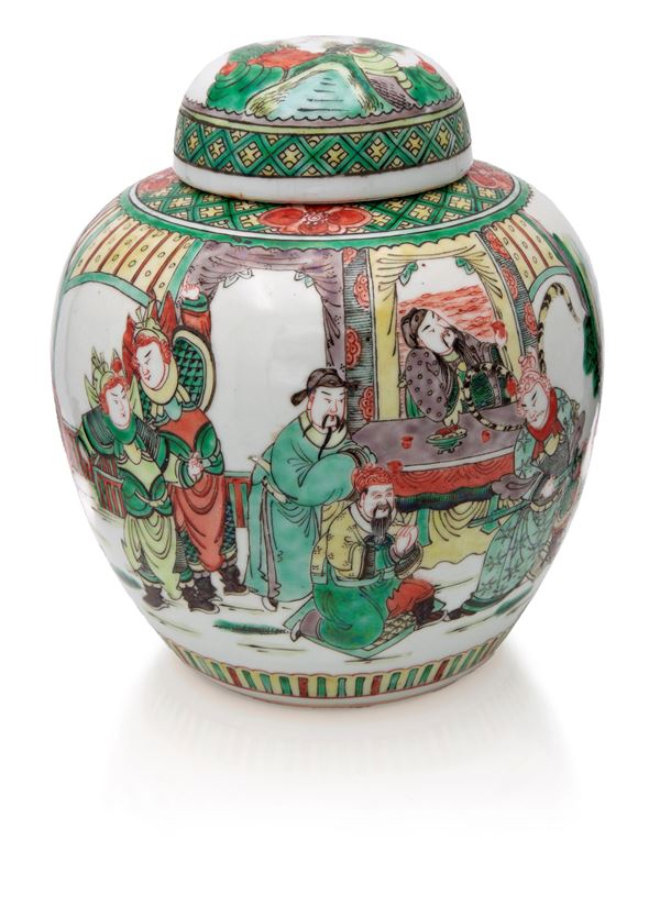 corpo ad anfora fondo turchese lumeggiato in oro, decorato da figure di amorino entro bordura dorata a motivi vegetali, cui corrisponde una vivace composizione di fiori multiformi e variopinti diametralmente opposta; sui lati teste d'ariete in bronzo dorato dalla cui sommità si erge un lungo stelo terminante a ricciolo su cui si avvolgono tralci di vite con grappoli d'uva. Orlo superiore percorso da rose in bronzo dorato; sostegno a rocchetto sorretto da motivi vegetali riuniti da ghirlande fiorite.