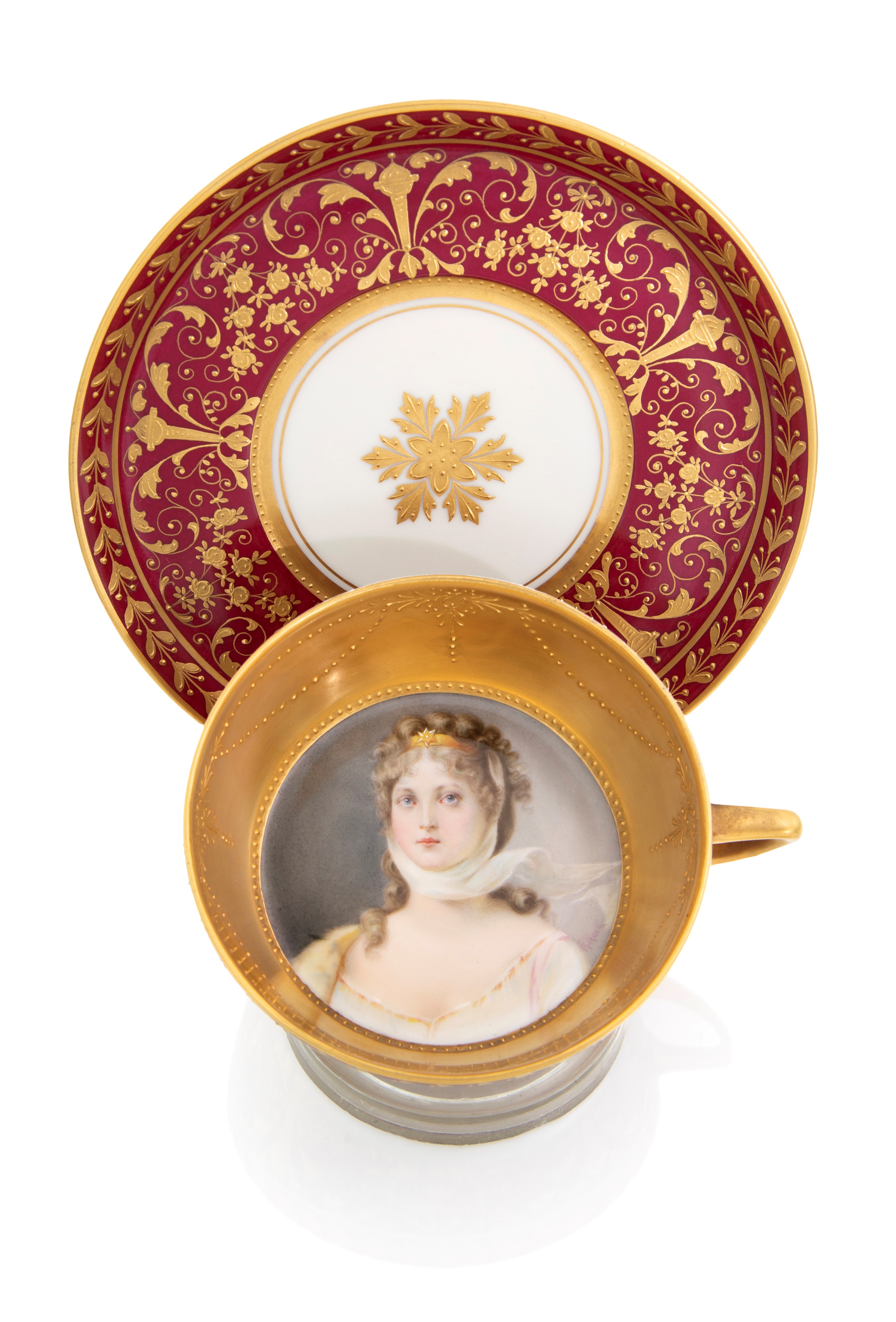 decorata al centro da miniatura raffigurante la Regina Luisa di Prussia (1776 -1810), dal ritratto del 1879 di Gustav Richter (1823-1884) custodito al Wallraf-Richartz Museum di Colonia, Germania. Il piattino e la parte esterna della tazze recano minuziosa decorazione dorata su fondo rosso porpora.