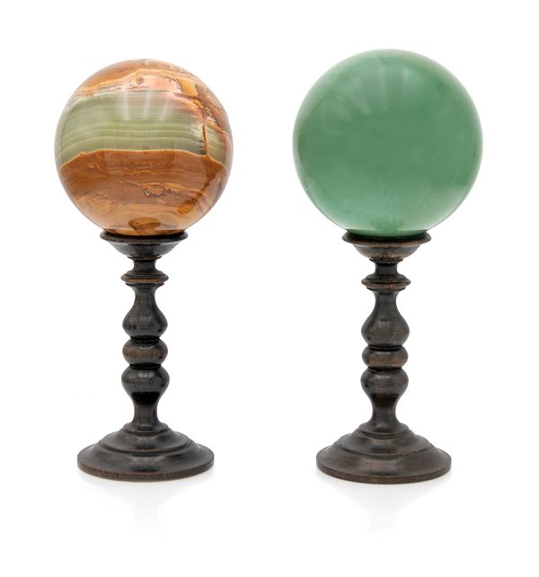 Due sfere in marmi diversi con piedistalli in legno tornito