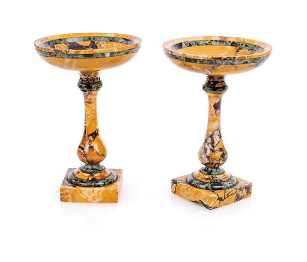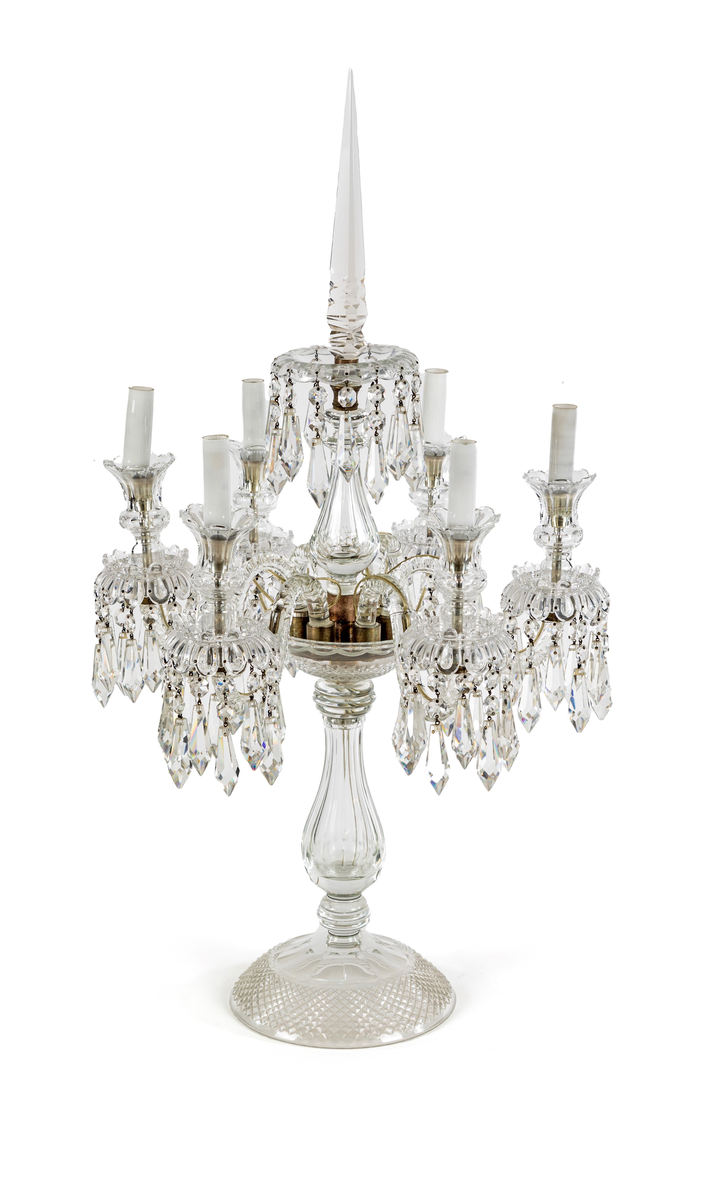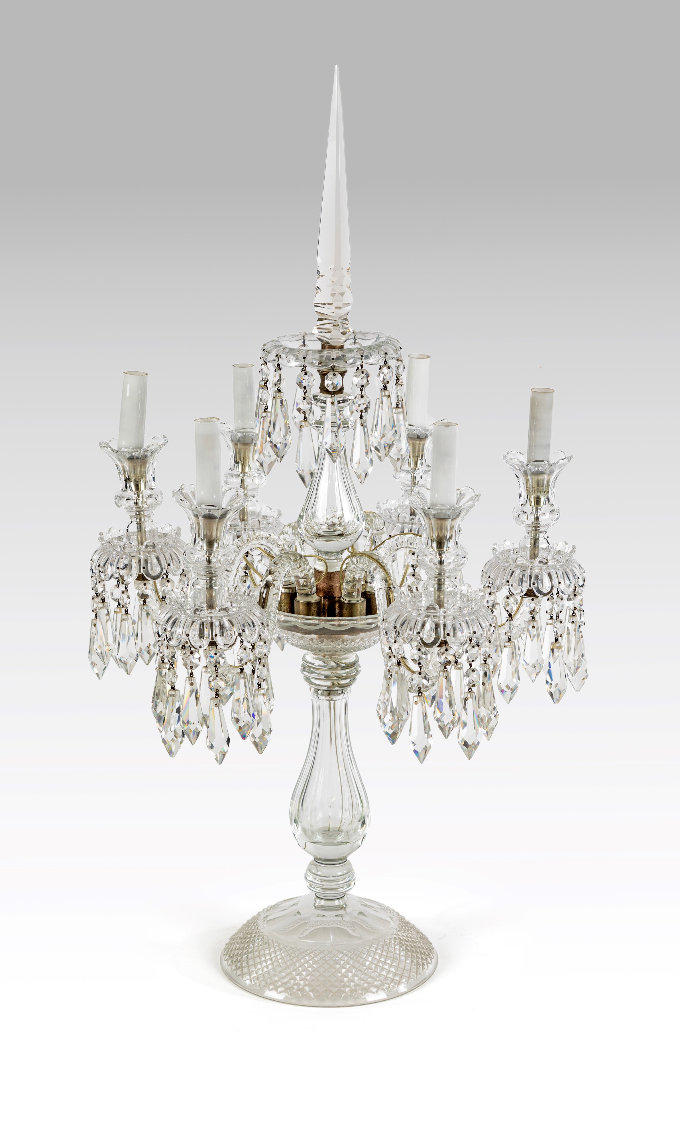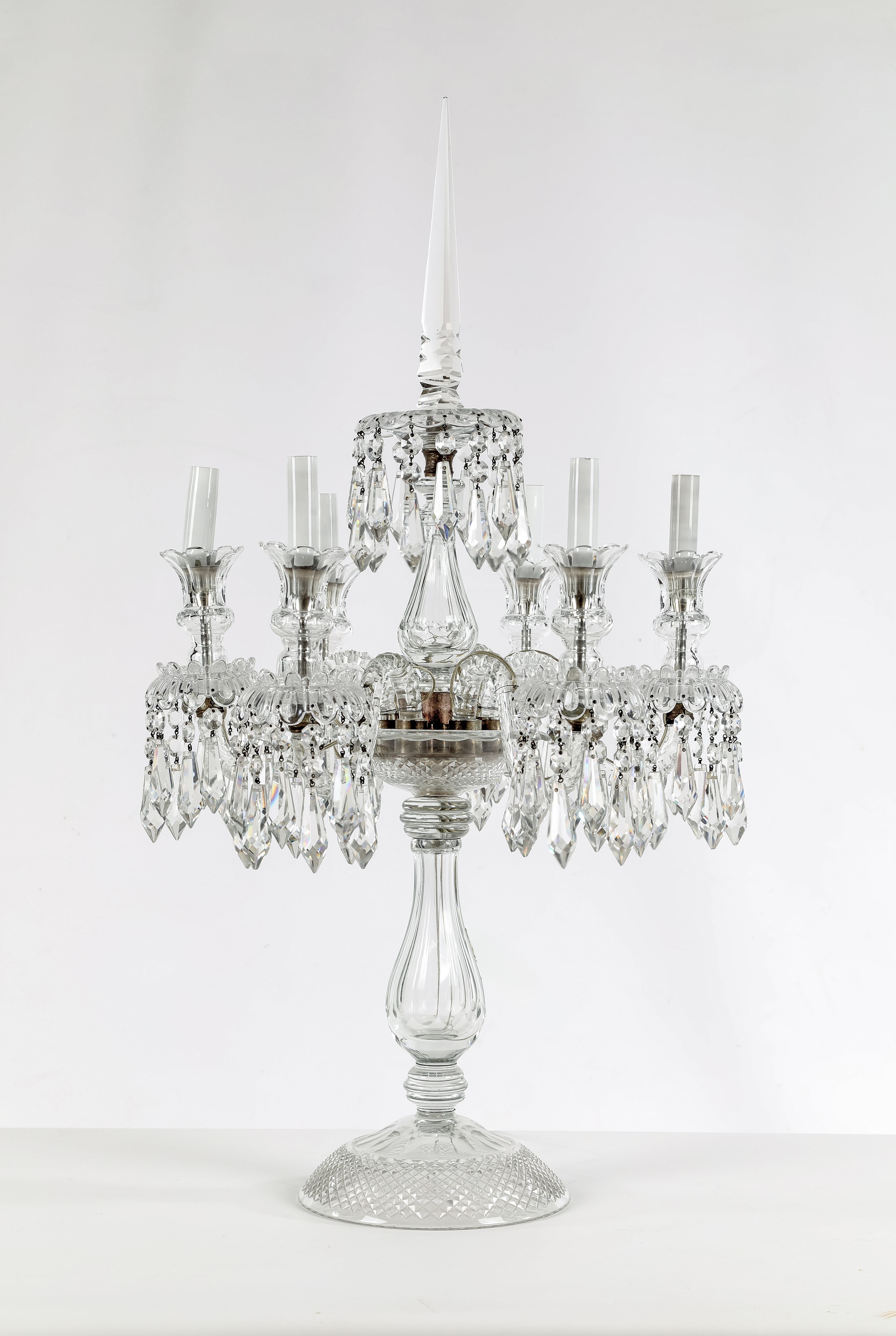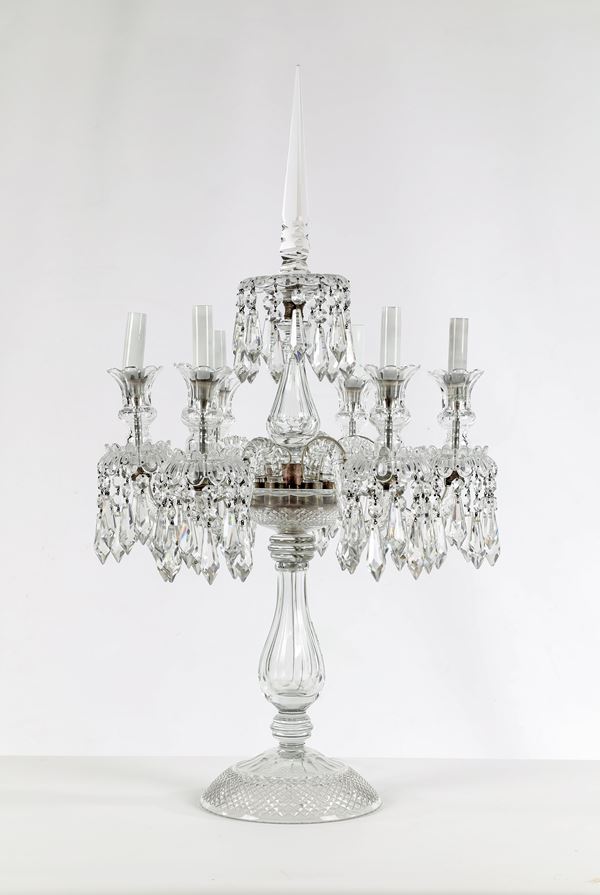 fusto centrale composito con doppio balaustro dominato da un obelisco, bracci arcuati con reggicandele guarniti da pandenti poliedrici, piede circolare intagliato a losanghe