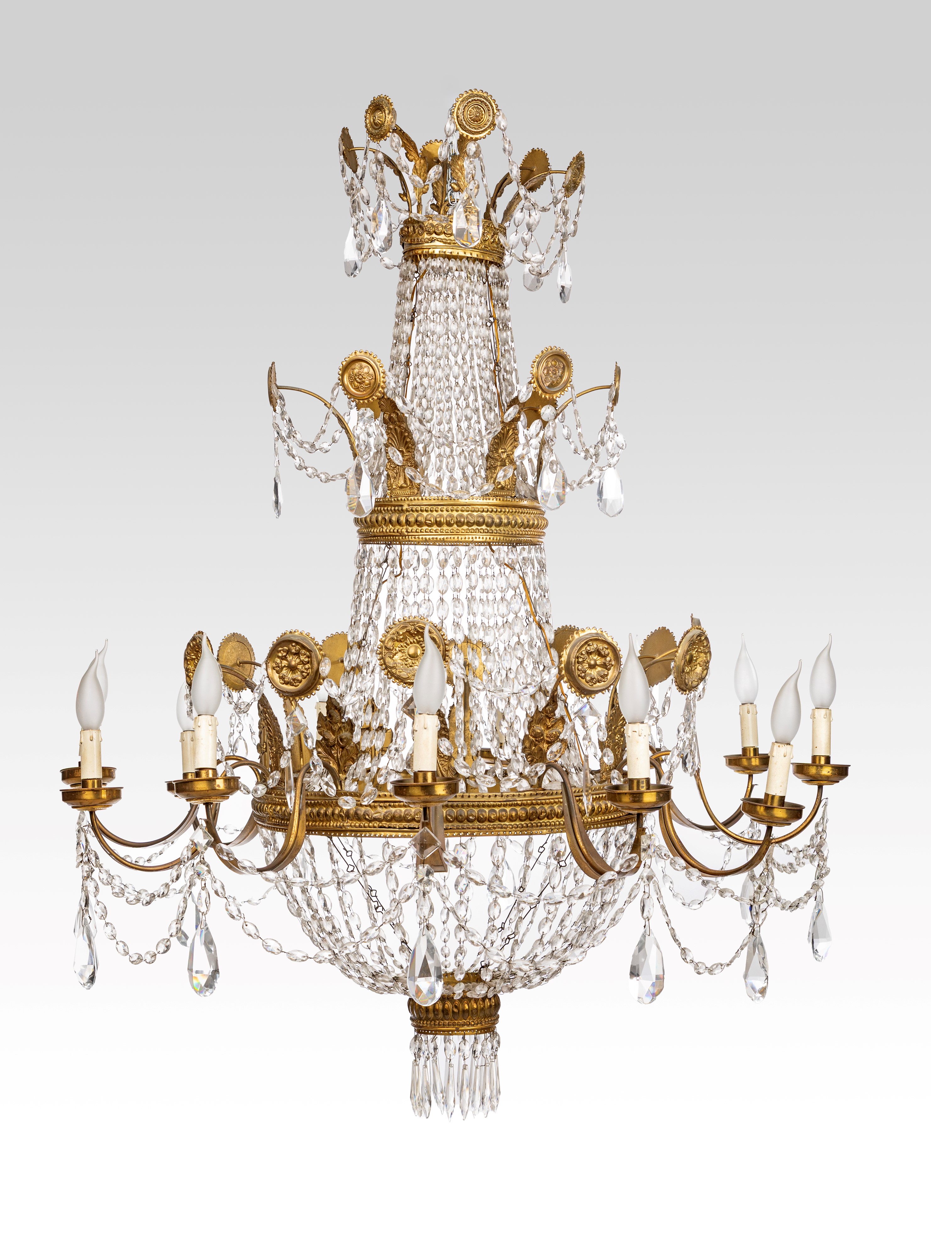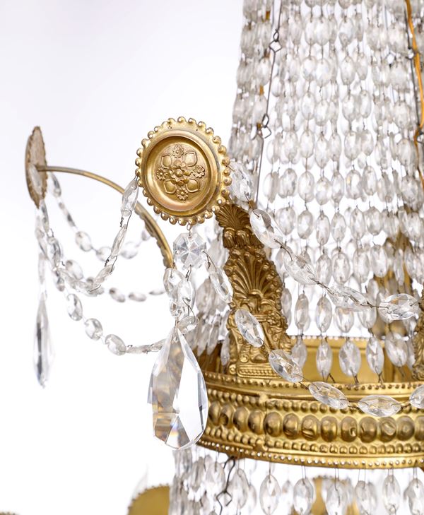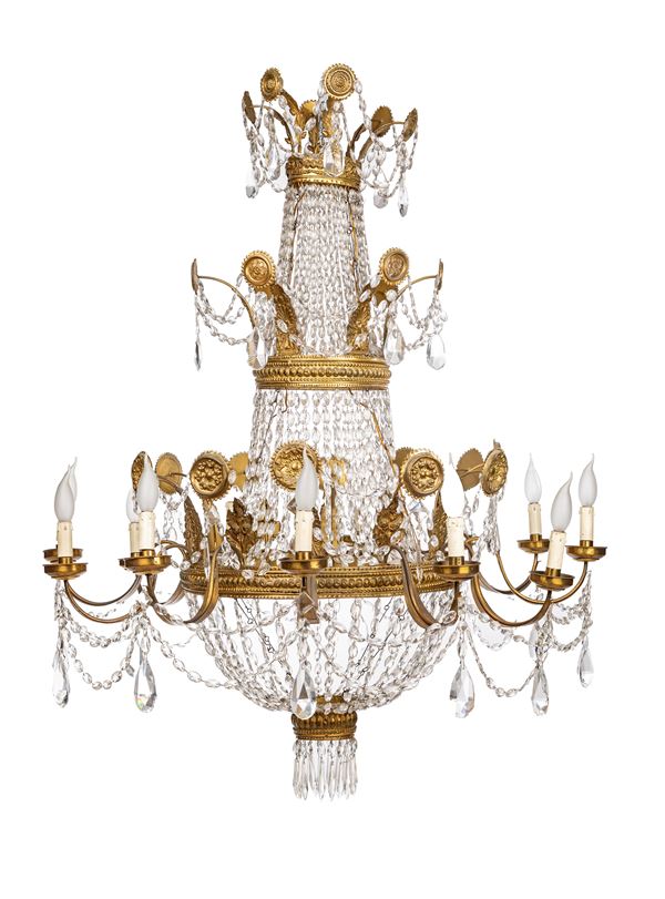 Grande lampadario a mongolfiera in ottone, tolla sbalzata e cristallo a dodici luci, XIX secolo