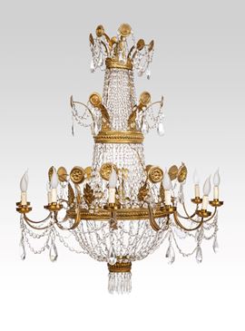 bracci arcuati disposti intorno la circonferenza dell'elemento portante percorso da perle e perline sbalzate; l'intera struttura è costituita da festoni con cristalli sfaccettati a sfera e a goccia riuniti sulla sommità ad anello guarnito da brevi rami di quercia con ghiande; ogni braccio è impreziosito da una placchetta circolare con corolla aggettante
