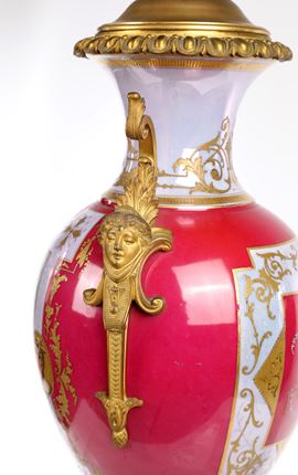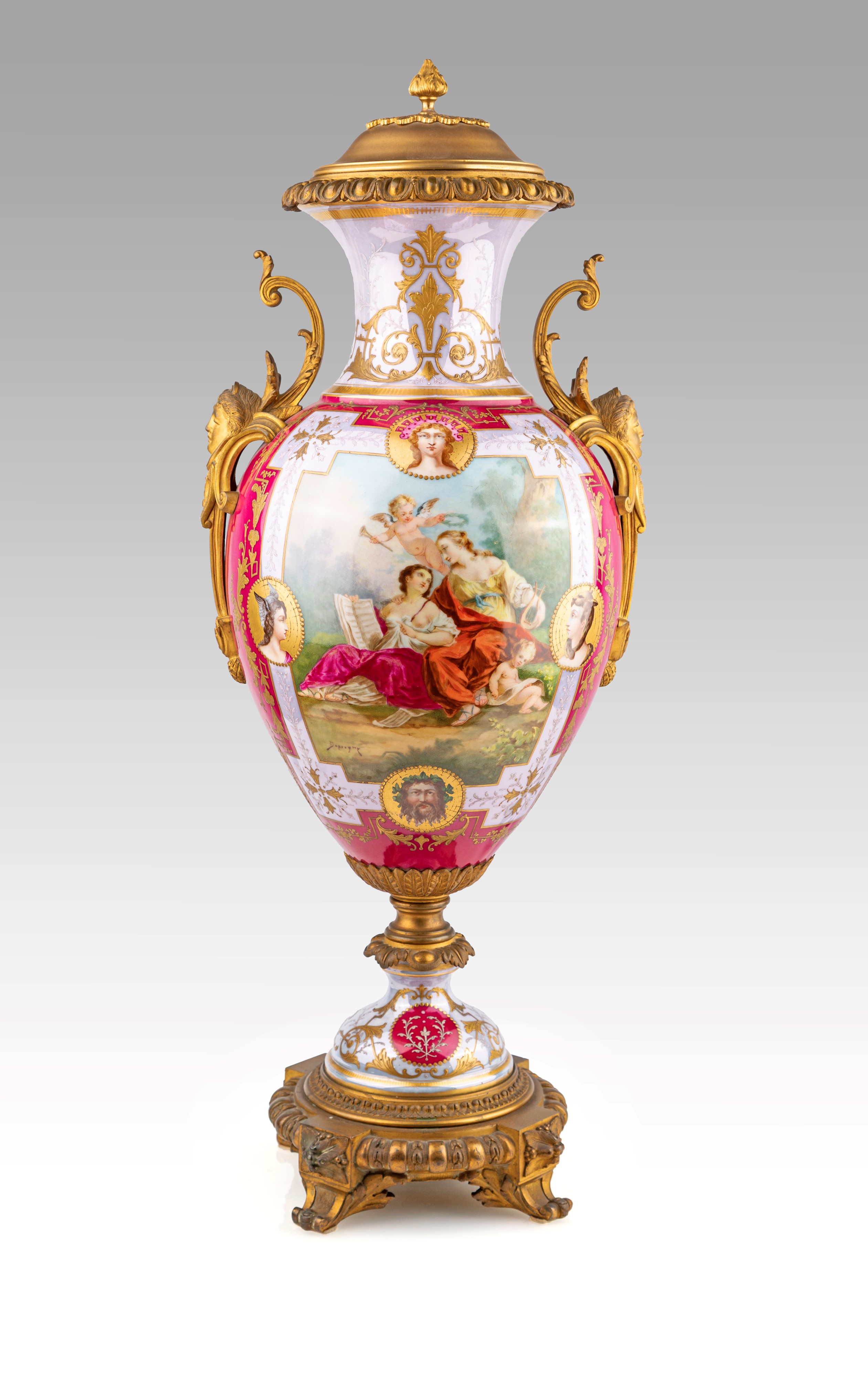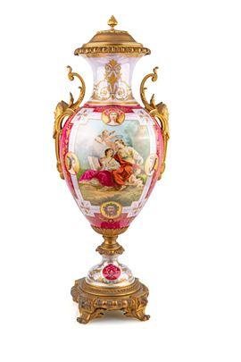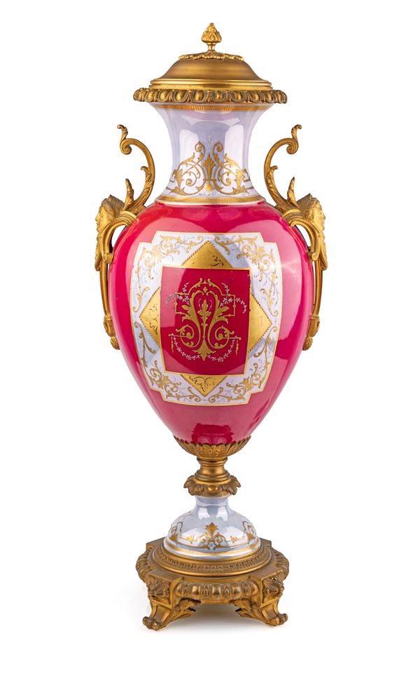 Grande vaso in porcellana di Sèvres rosso porpora con figure mitologiche policrome e montatura in bronzo dorato, Francia, XIX secolo