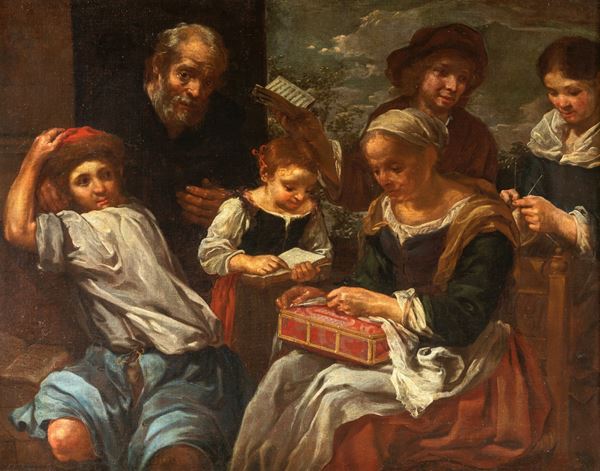 Questa scena, ambientata all’aperto, raffigura un gruppo familiare in cui le figure femminili sono protagoniste delle attività domestiche – filatura, lavoro a maglia e lettura – mentre le presenze maschili e infantili equilibrano la composizione. L’articolata disposizione dei personaggi conferisce alla scena un chiaro valore allegorico, alludendo alle diverse età della vita, rappresentate da figure di età differente raccolte attorno alla più anziana, identificabile come la nonna.
