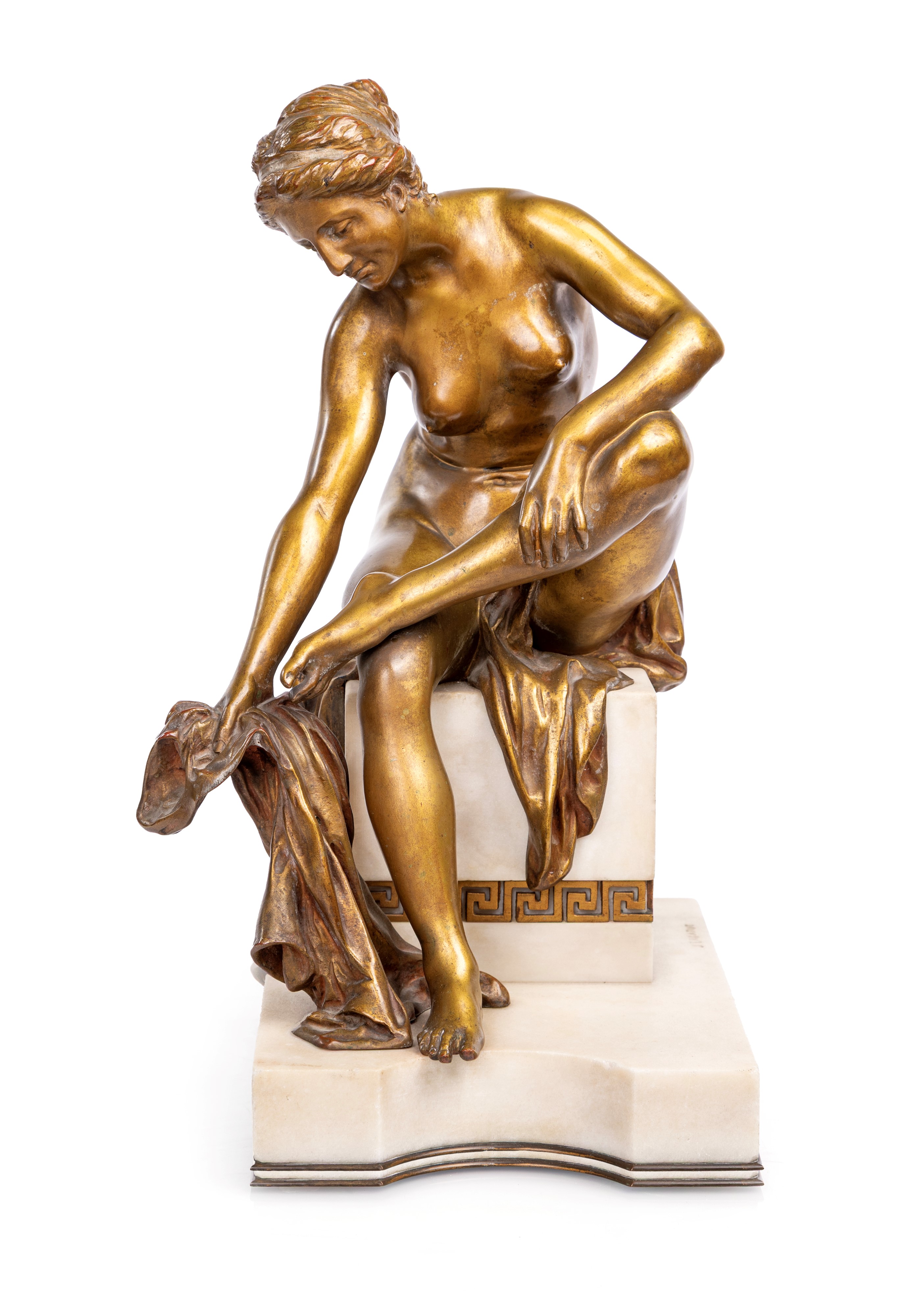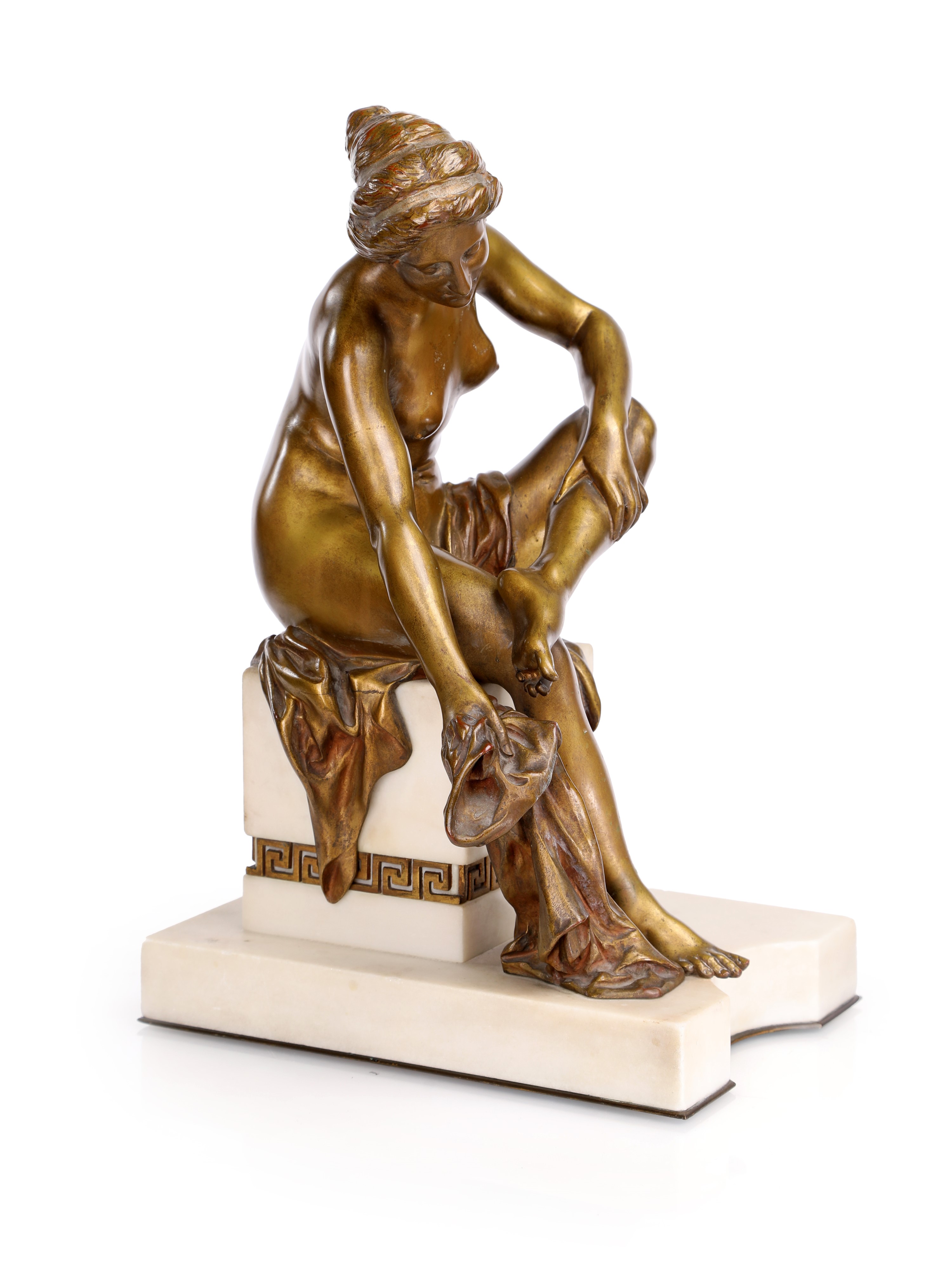 bronzo a patina dorata, su base in marmo bianco con fregio a greca