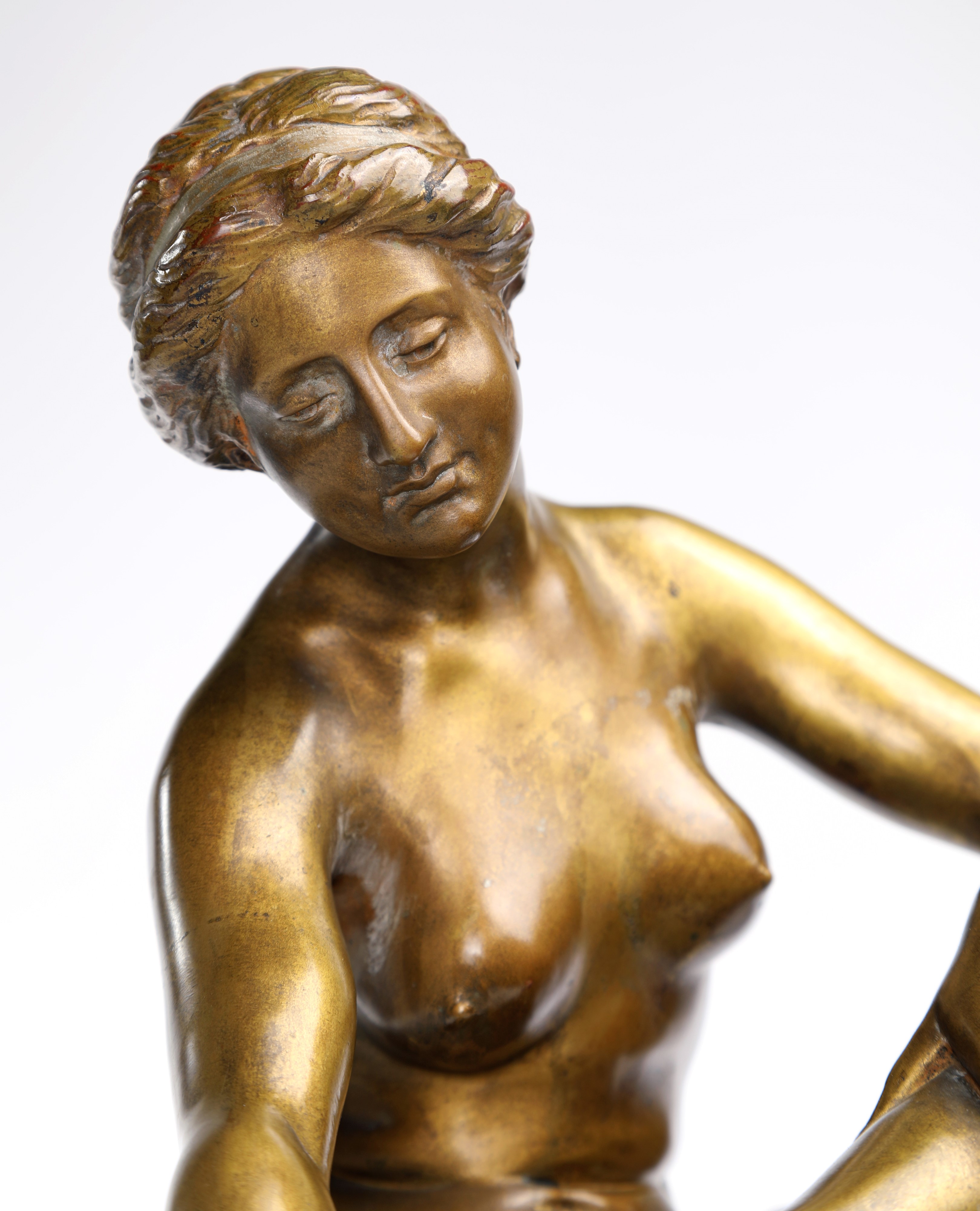 La scultura raffigura una giovane donna nuda, colta in un momento intimo e quotidiano, seduta su un blocco in marmo bianco. Il corpo è leggermente inclinato in avanti; la gamba sinistra piegata poggia sul ginocchio della gamba destra che scende naturalmente; con una mano la figura trattiene un drappo che scivola verso il basso. La base marmorea decorata da una cornice a greca, richiama modelli classici.