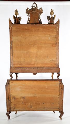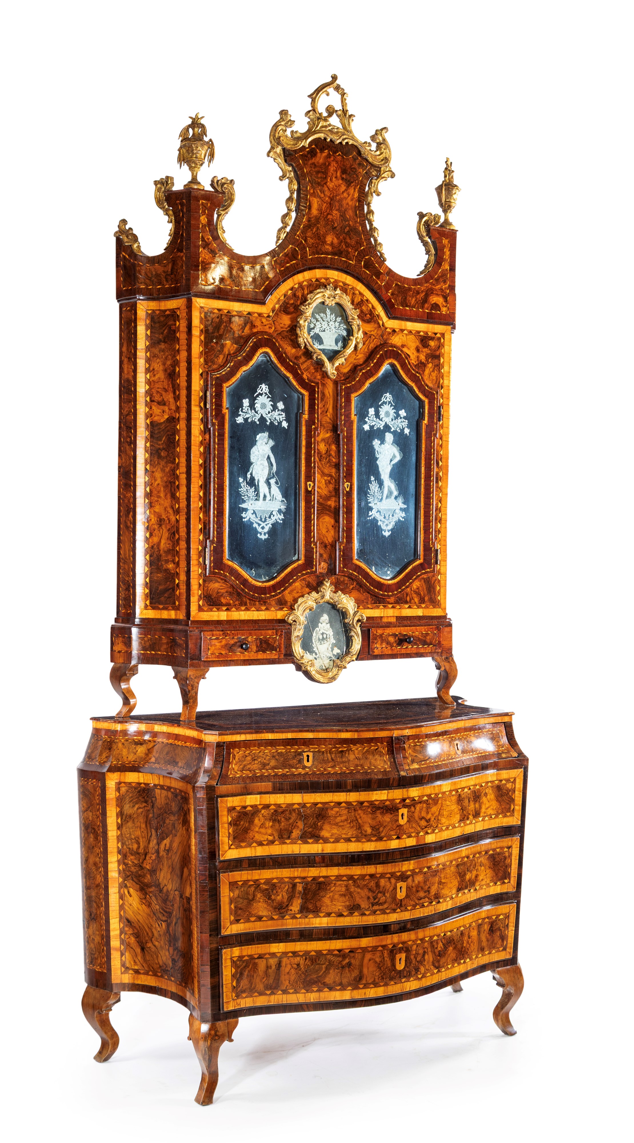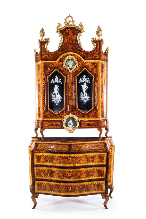con specchiature in radica incorniciate da filettature in ciliegio sottolineate da bordure a motivi geometrici in essenze a contrasto; corpo superiore coronato da timpano spezzato rifinito da rilievi vegetali minuziosamente intagliati e dorati, con vasi scolpiti a tutto tondo e brevi cascatelle di boccioli che dalla sommità discendono lungo la curva degli elementi laterali. Facciata decorata da specchi sagomati con composizioni floreali e figure di Diana e di Apollo incise, racchiusi da cornici in legno intagliato e dorato, scandita da due ante e due cassetti in linea sottostanti. Corpo inferiore di linea mossa, con fascia a cavetto suddivisa in due tiretti e tre cassetti in colonna di linea lievemente convessa; fianchi concavi delimitati da spigoli scantonati, piedi incurvati. Difetti e sostituzioni.