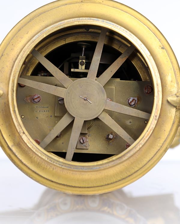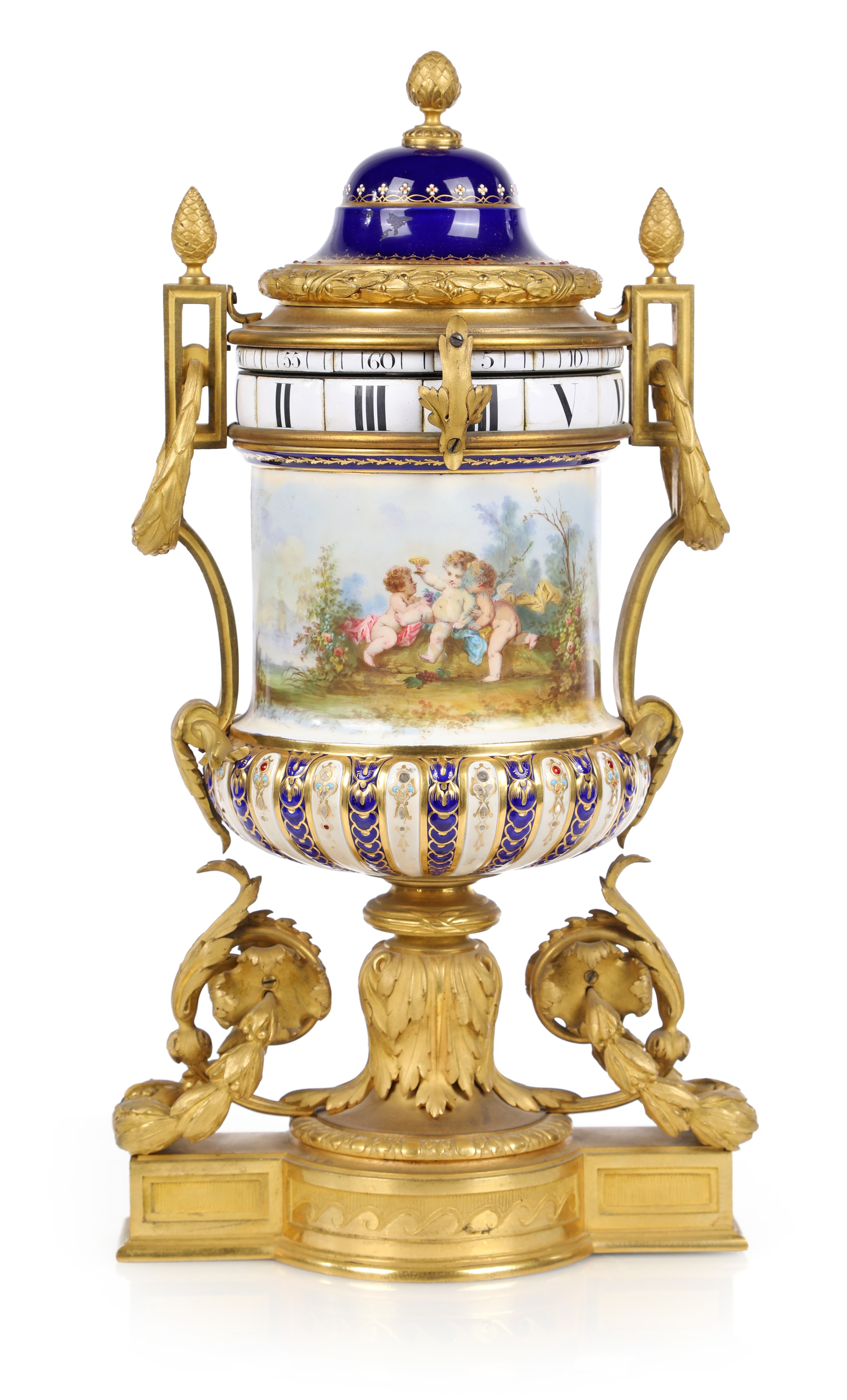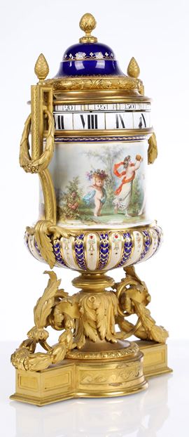 corpo a vaso decorato in vivace policromia con figure mitologiche e puttini ambientati in un paesaggio bucolico; lungo il profilo superiore, su cui è fissato il coperchio, si dispongono ad anello, con movimento orizzontale, due ordini di placchette in smalto bianco con indicazione oraria a numeri romani ed arabi per i minuti. Corone d'alloro abbelliscono le anse squadrate e i due riccioli che fungono da sostegno. Basamento in bronzo dorato. Meccanica da revisionare, firmata "Gailleaux à Paris".