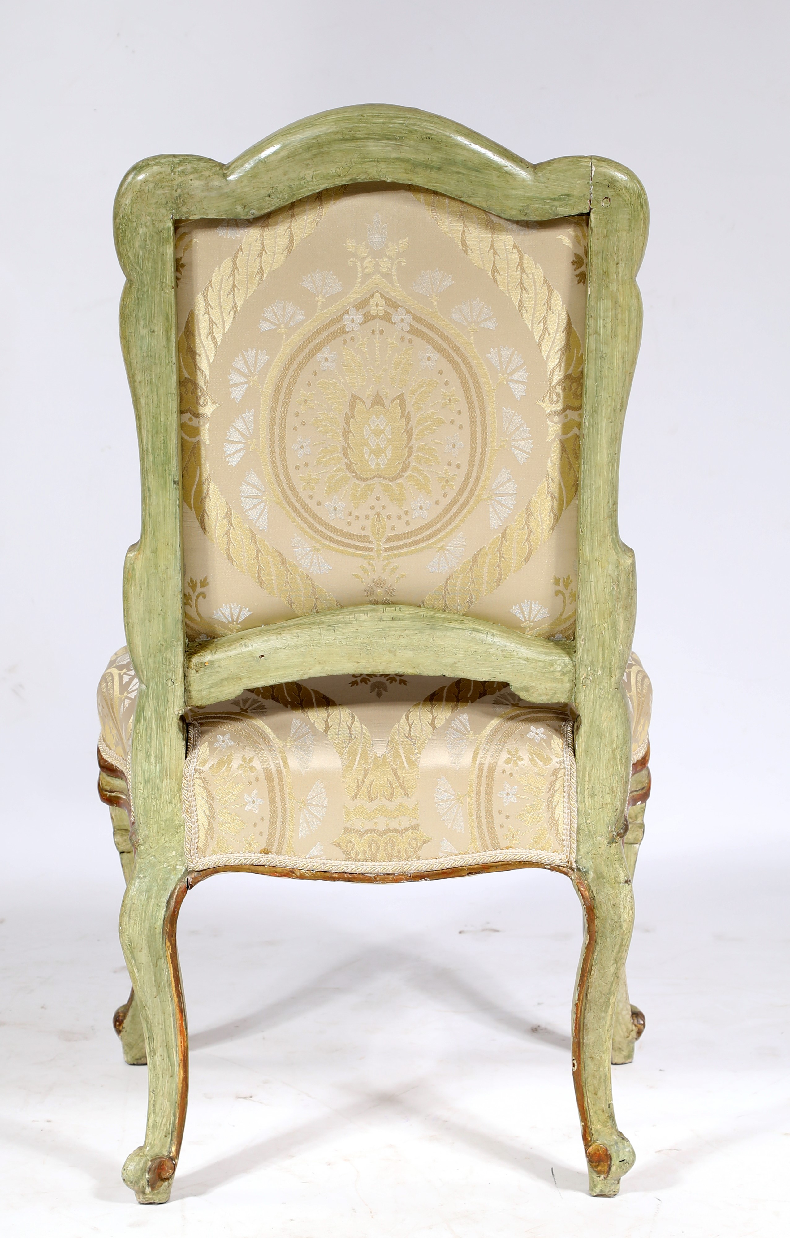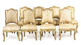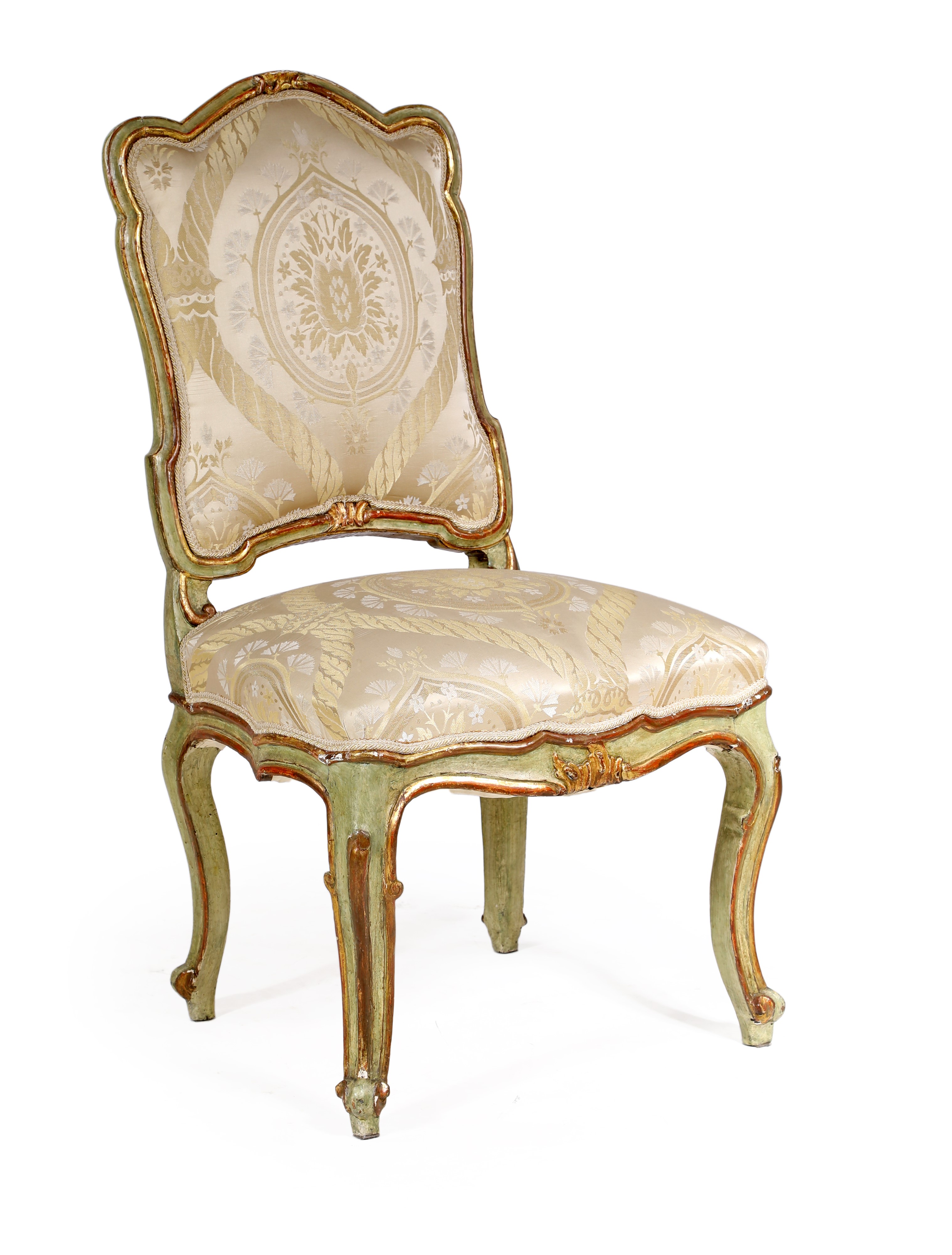 Otto sedie in legno laccato verde pastello con profili dorati, metà del XVIII secolo