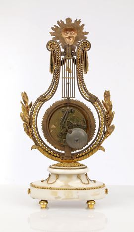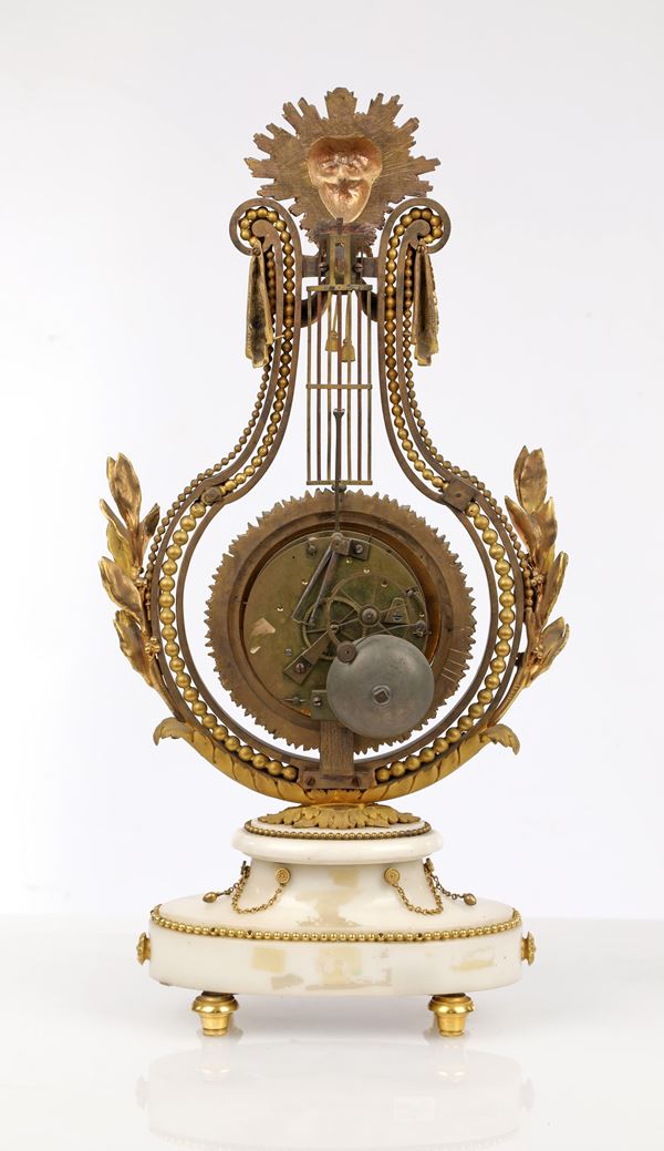 Pendola a lira basculante in bronzo dorato e marmo bianco, Francia, Luigi XVI