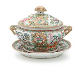 Piccola zuppiera con coperchio e vassoio in porcellana Famiglia Rosa arricchita da filetti e dettagli in oro, Canton, Cina, dinastia Qing, XIX secolo