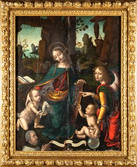 L’opera riprende la celebre composizione della Vergine delle Rocce di Leonardo da Vinci, uno dei modelli iconografici più influenti del Rinascimento lombardo. Il dipinto presenta la Madonna con il Bambino, san Giovannino e un angelo, inseriti in un ambiente roccioso di ascendenza leonardesca, con evidenti richiami alla cultura figurativa sviluppatasi attorno alla bottega del maestro. In basso a sinistra è raffigurata una figura maschile a mezzo busto, con le mani giunte in atteggiamento di preghiera, verosimilmente interpretabile come committente.