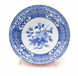 decorata esternamente in monocromia rosso ferro e all'interno in monocromia blu su fondo bianco; al centro un tralcio con melagrane e lungo il bordo quattro riserve sagomate con composizioni floreali su fondo a grillage centrato da corolle. Reca marchio in blu sottosmalto ed etichetta del rivenditore "Carini"