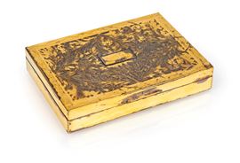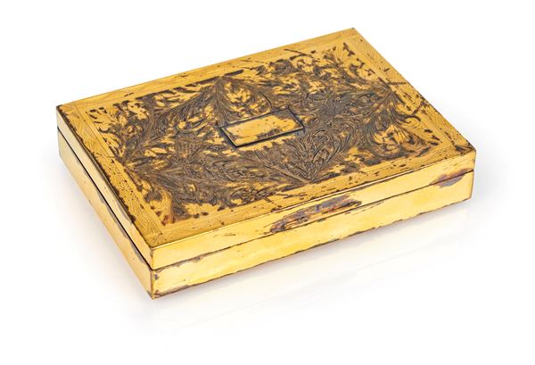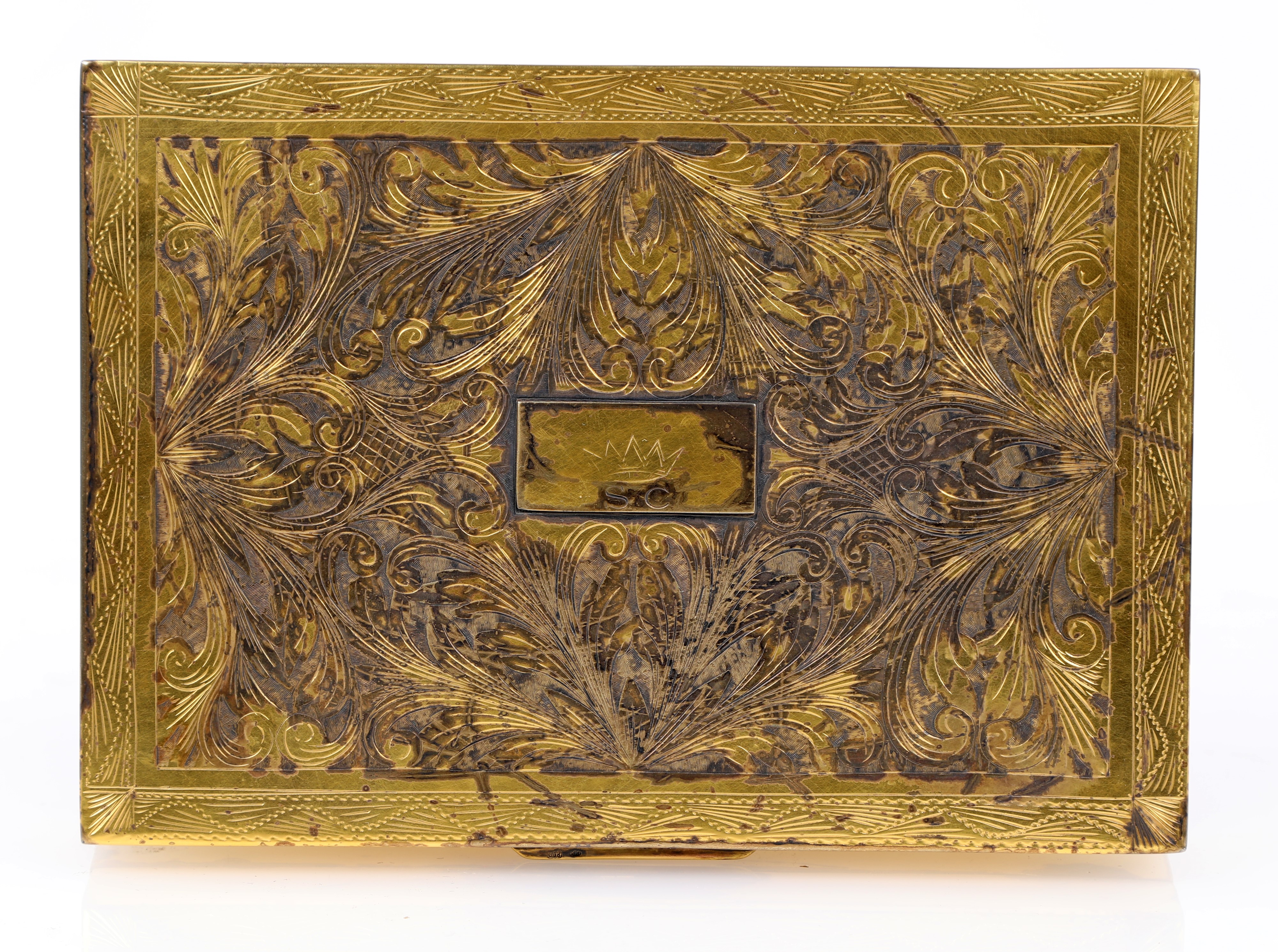 coperchio incernierato con fitta decorazione incisa a motivi vegetali; al centro iniziali S.C. sormontate da corona. Segni di uso e difetti alla doratura.