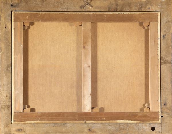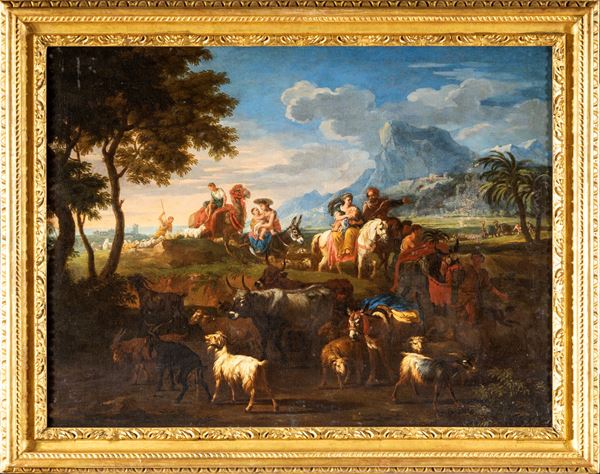 Il dipinto raffigura un ampio paesaggio animato dal passaggio di una carovana di viandanti a cavallo e a dorso d’asino, accompagnati da armenti disposti in primo piano. La composizione si articola in un ricco scenario naturale, con alberi frondosi che incorniciano la scena, un corso d’acqua che guida lo sguardo in profondità e un fondale montuoso avvolto da una luce atmosferica morbida e diffusa. Particolare attenzione è riservata alla resa degli animali e al carattere narrativo dell’episodio, elementi che, insieme all’equilibrata disposizione delle figure, rimandano alla cultura figurativa della scuola genovese del XVII secolo, sensibile a un naturalismo vivace e a un gusto scenografico di matrice barocca, in dialogo con la tradizione del paesaggio animato e della pittura di genere.