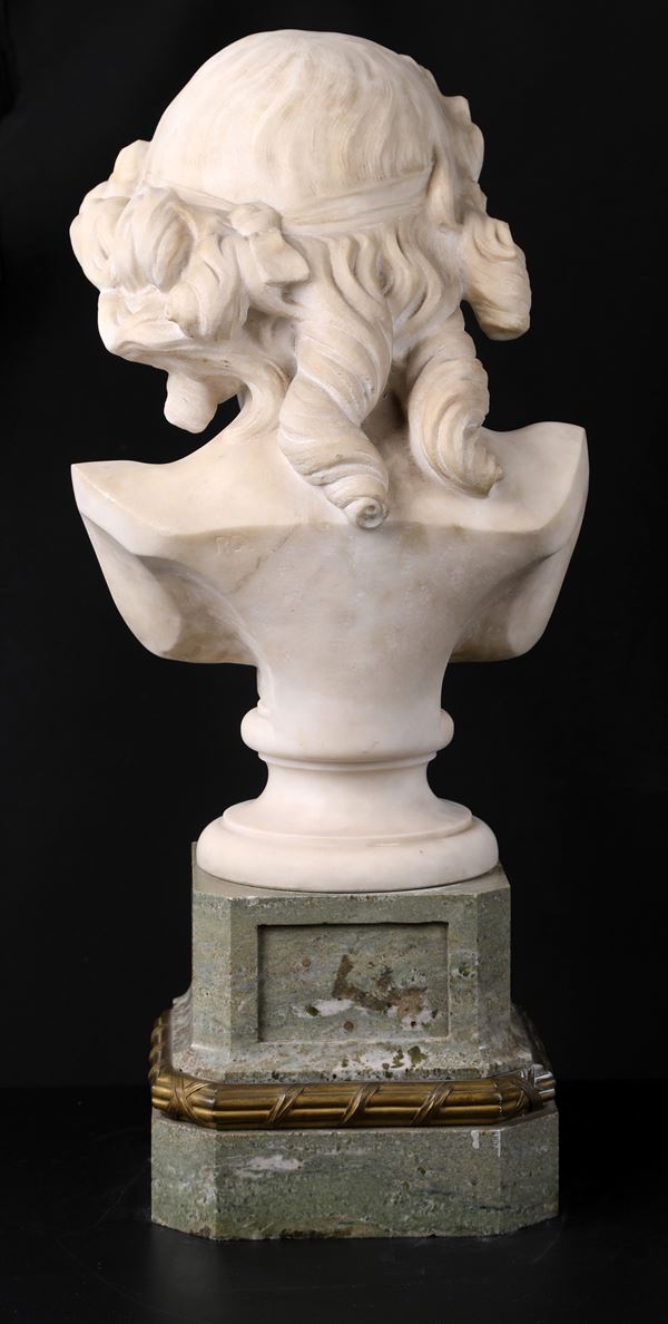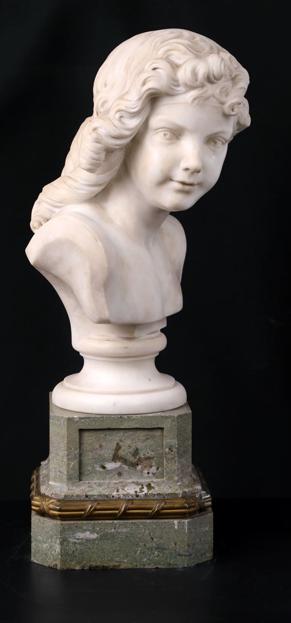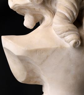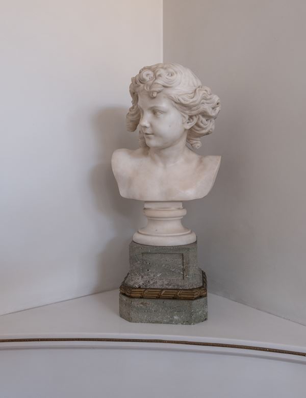 il volto rivolto verso la spalla destra, i capelli ondulati idealmente mossi dal vento ed un ricciolo ricadente sulla fronte. Piedistallo a rocchetto su base squadrata in marmo grigio. Reca incisa a verso della spalla sinistra le iniziali "P.G." non identificate.