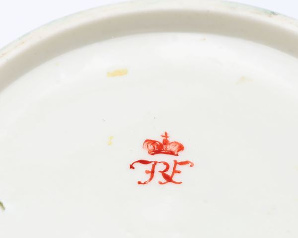 decorata da bouquet con rose; profili in verde e oro; manici dorati; coperchio sormontato da un frutto. Marca in rosso. Lievi difetti e piccole mancanze