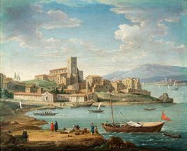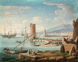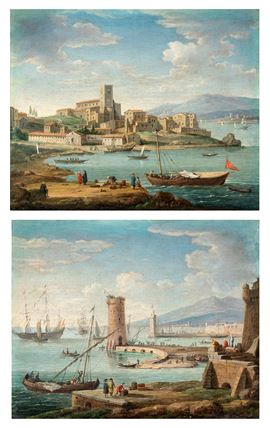 In una delle due tele, il raggruppamento di edifici lungo la costa si distingue per l’equilibrio e la naturalezza della disposizione, tanto da suggerire che non si tratti di una veduta di fantasia, bensì della rappresentazione di un luogo reale esistente nel Settecento, verosimilmente individuabile lungo la costa laziale. L’insieme architettonico, integrato armoniosamente nel paesaggio, contribuisce a rafforzare il carattere di verosimiglianza e la qualità narrativa della scena.