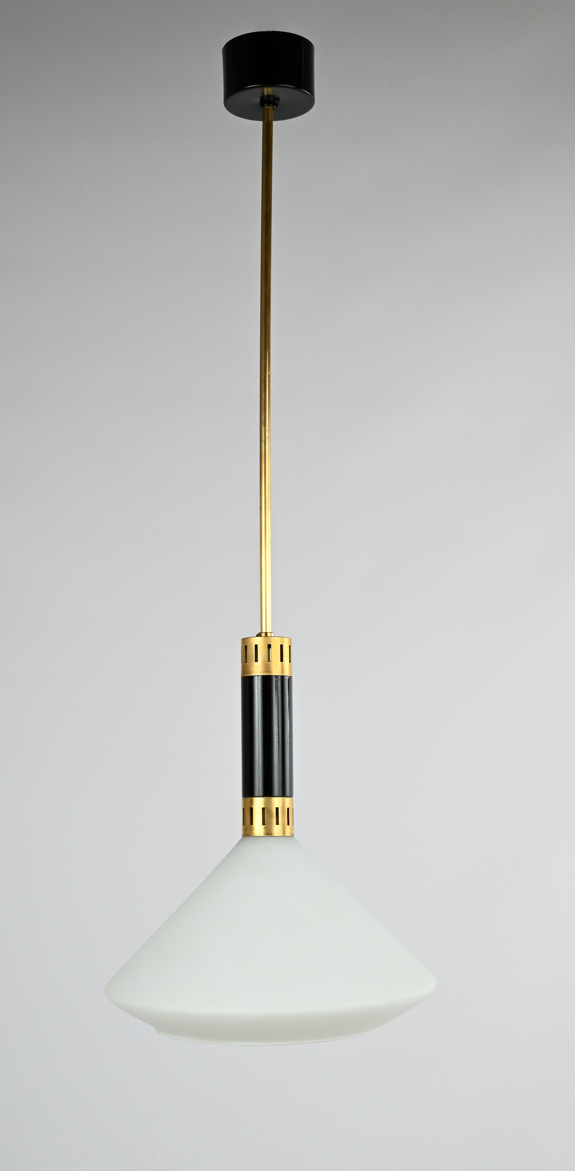 Struttura in metallo laccato nero e ottone, paralume in vetro bianco
