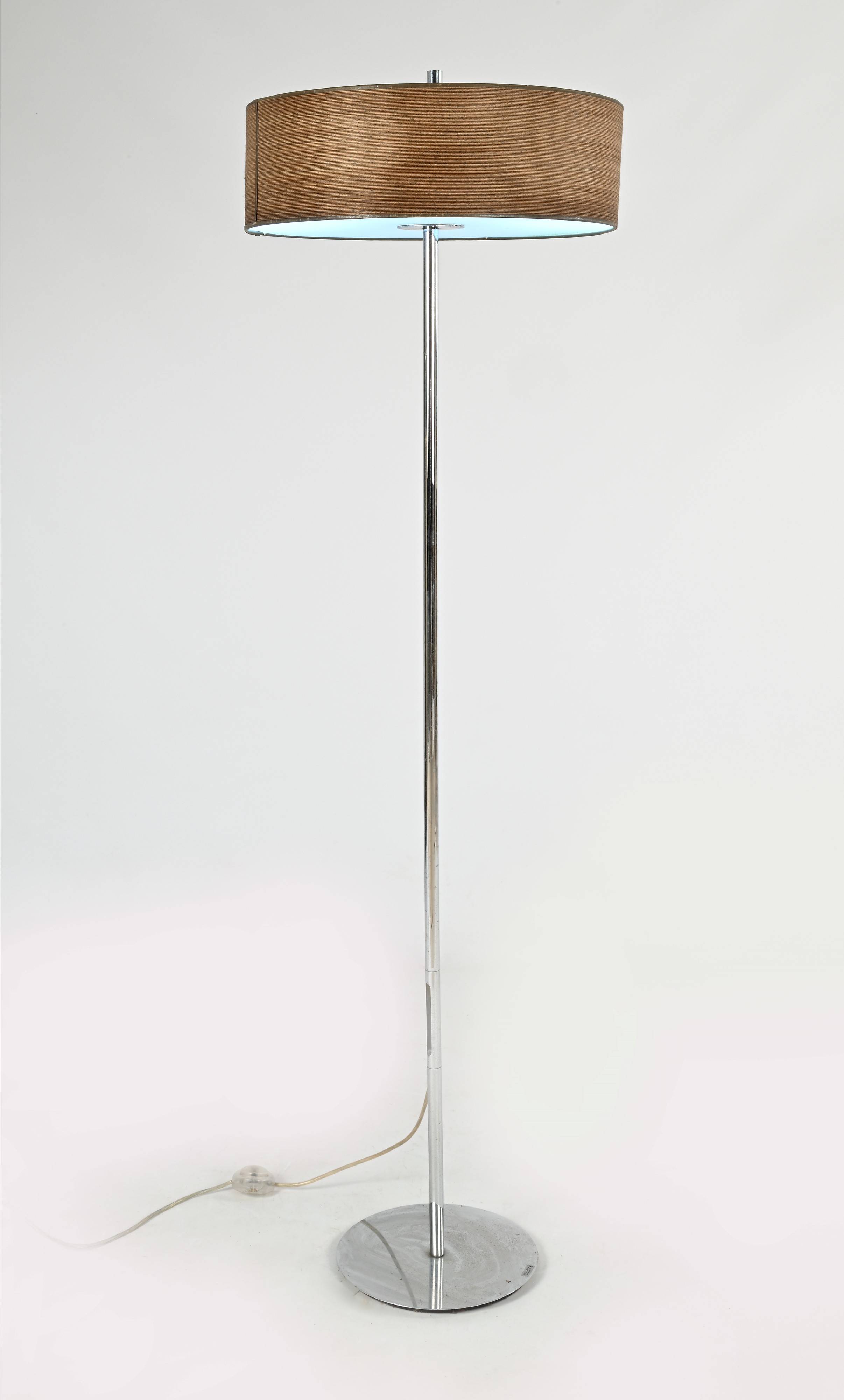 Struttura in metallo cromato, paralume in tessuto marrone e diffusore in vetro opalino