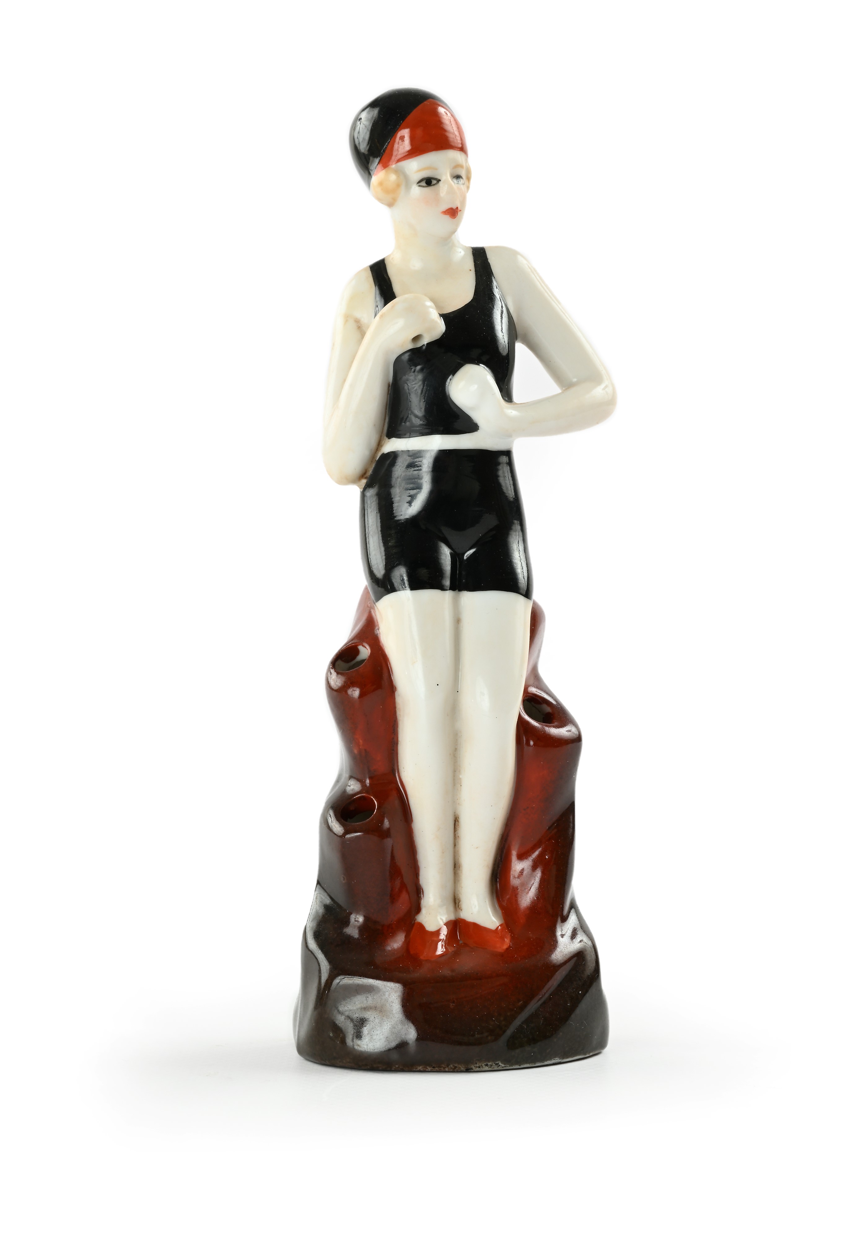 Porcellana dipinta nei toni del nero e del rosso. Reco al verso foro per porta pennino e 4 fori laterali.