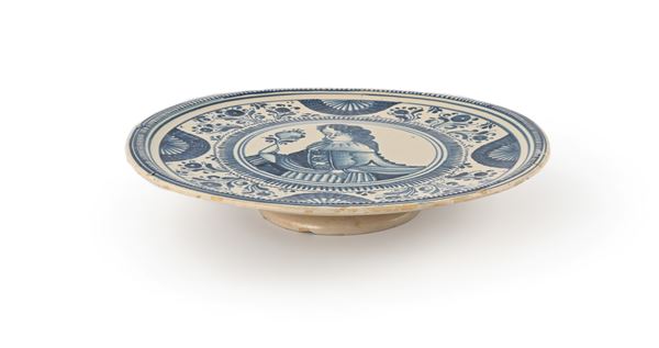 piatto circolare decorato da figura femminile a mezzo busto racchiusa in un cerchio circondata da fiori recisi stilizzati con gambi sinuosi arricchiti da foglie, alternati a motivi a raggiera disposti lungo la tesa; basso piede circolare
