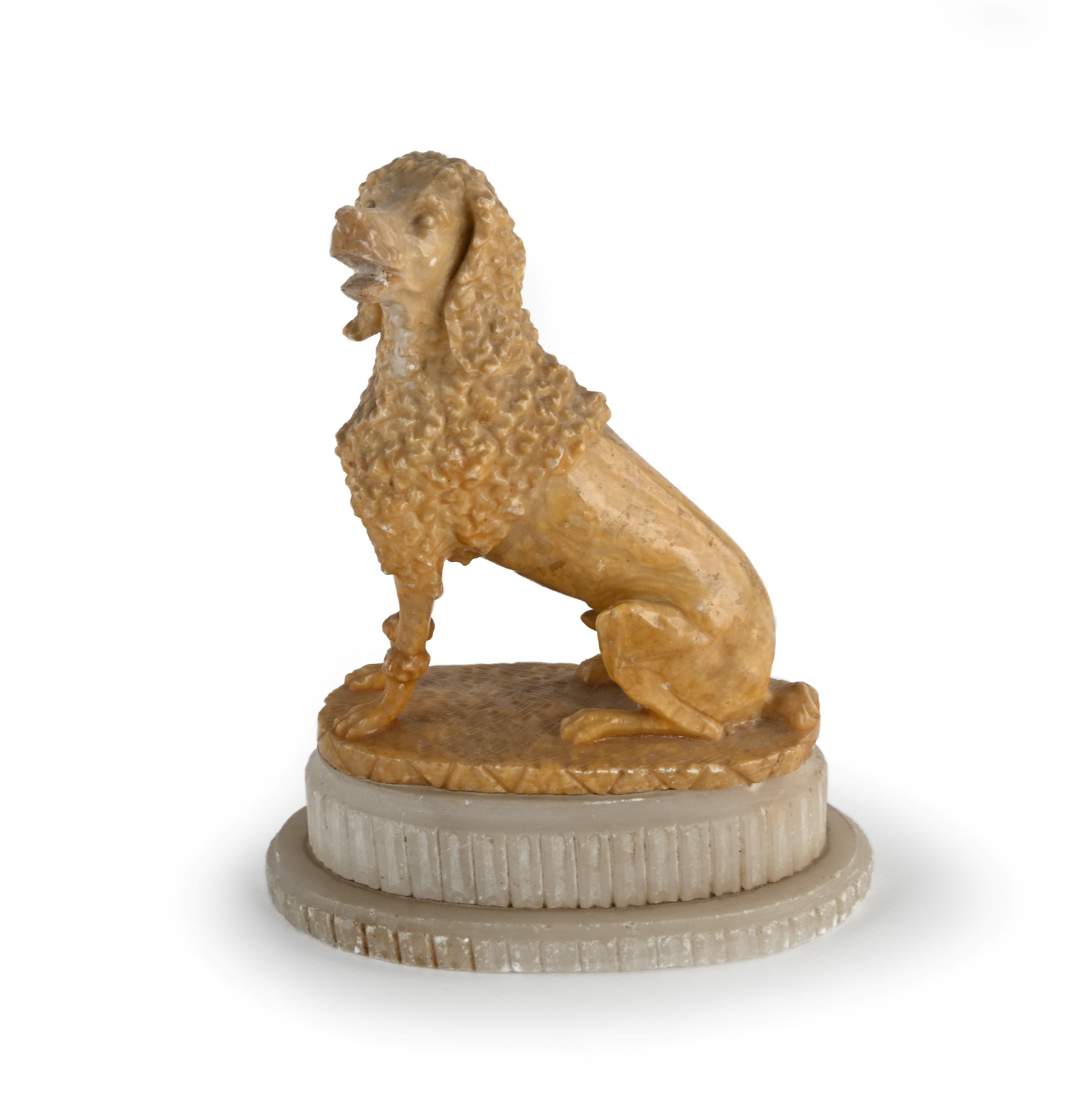 Breton Epagneul in alabastro a patina ambrata, seconda metà del XIX secolo