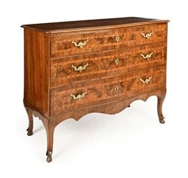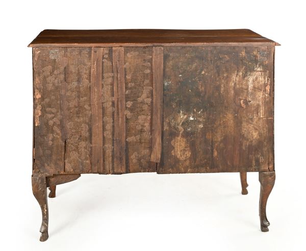 facciata lievemente sagomata suddivisa in tre cassetti incorniciati da bordure intarsiate in legni di frutto a motivi diagonali, gambe mosse