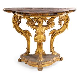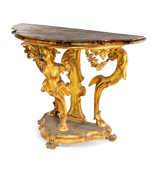 Console barocca in legno dorato con piano sagomato in marmo, Toscana, XVIII secolo