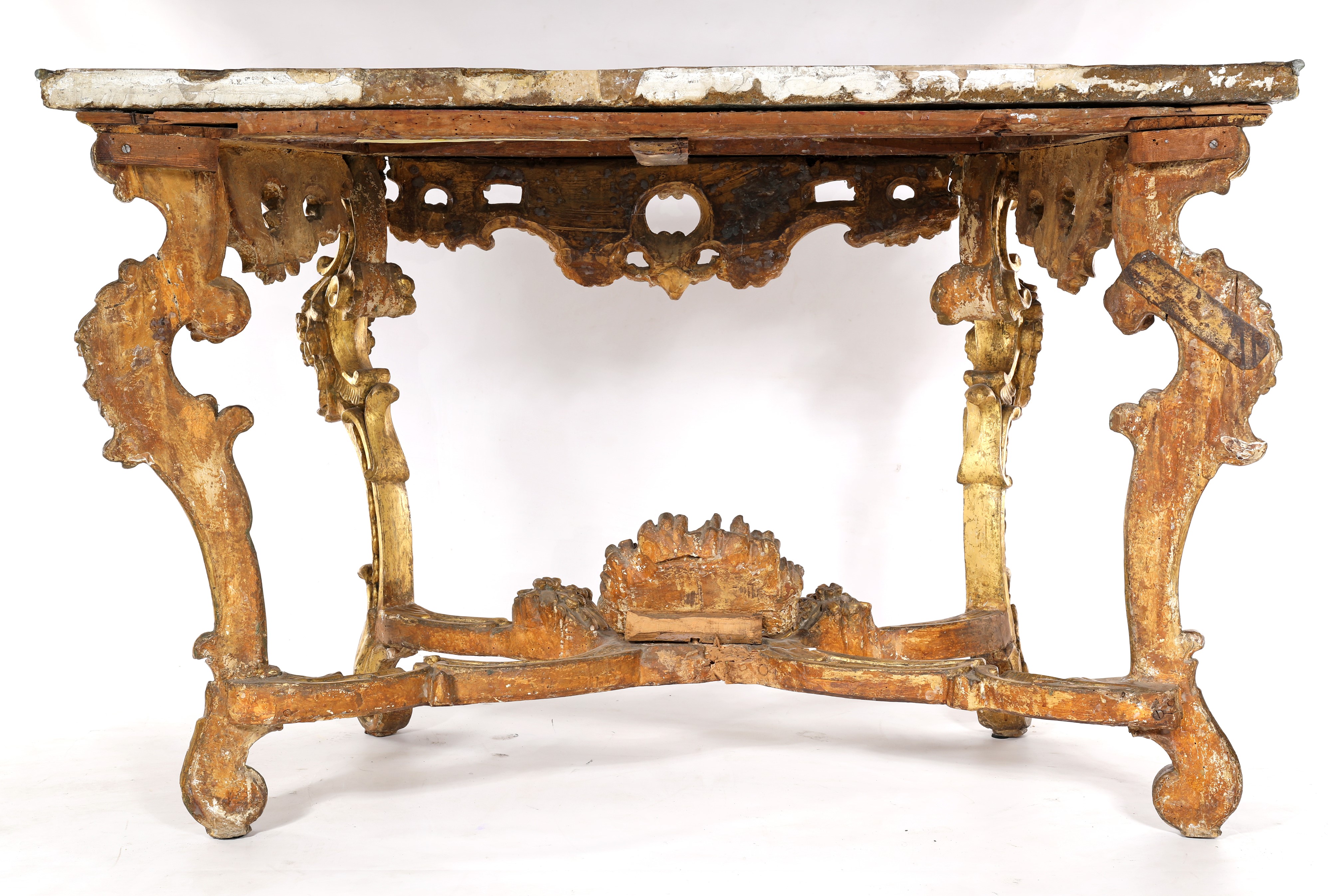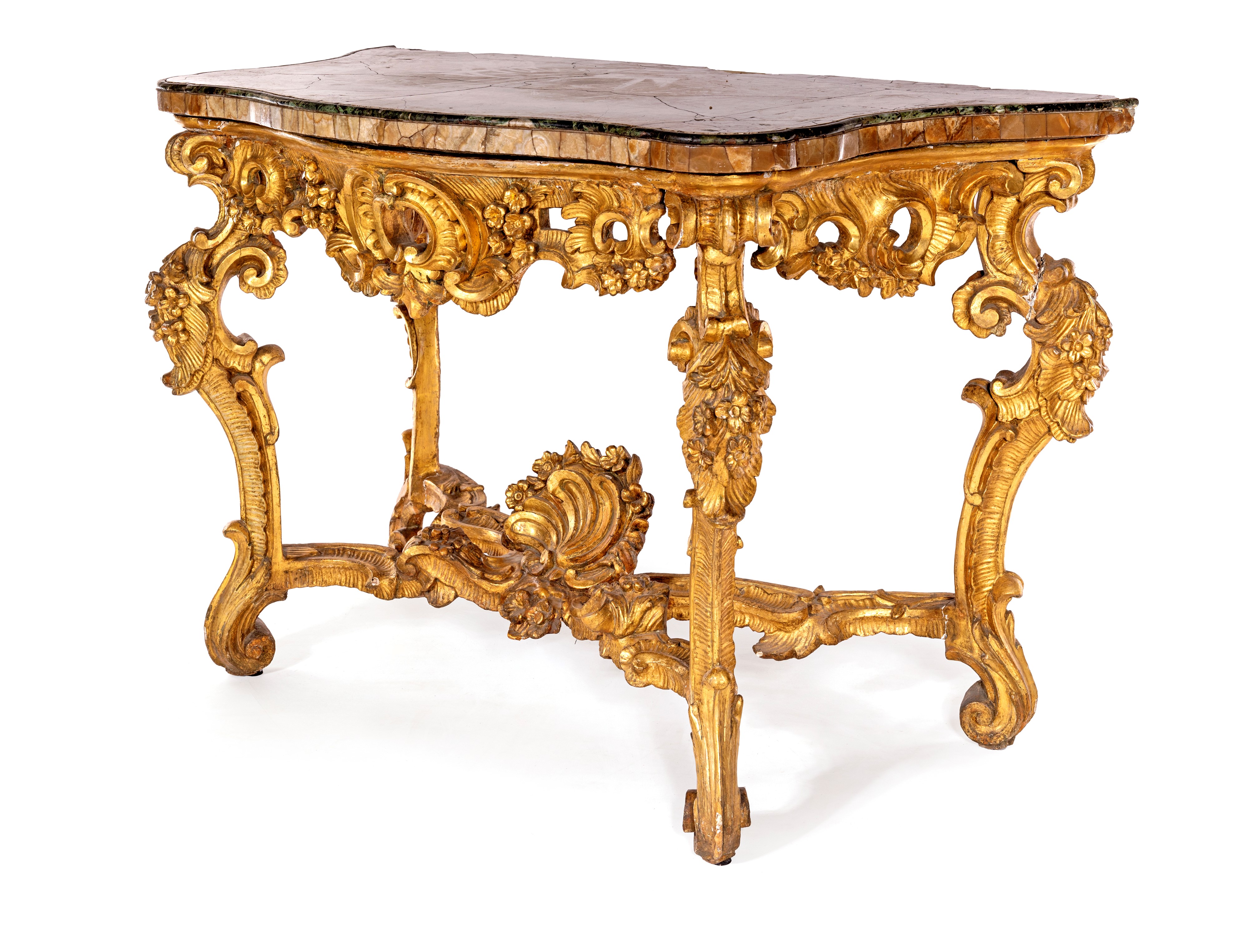 piano sagomato lastronato in marmo con cordolo verde, fascia centrata da un ampio cartiglio a giorno affiancato da volute e rilievi fioriti, elementi decorativi ripresi a costruzione dell'intera struttura; gambe sagomate terminanti a ricciolo inverso, riunite da crociera dominata da una valva. Lievi difetti e piccole mancanze