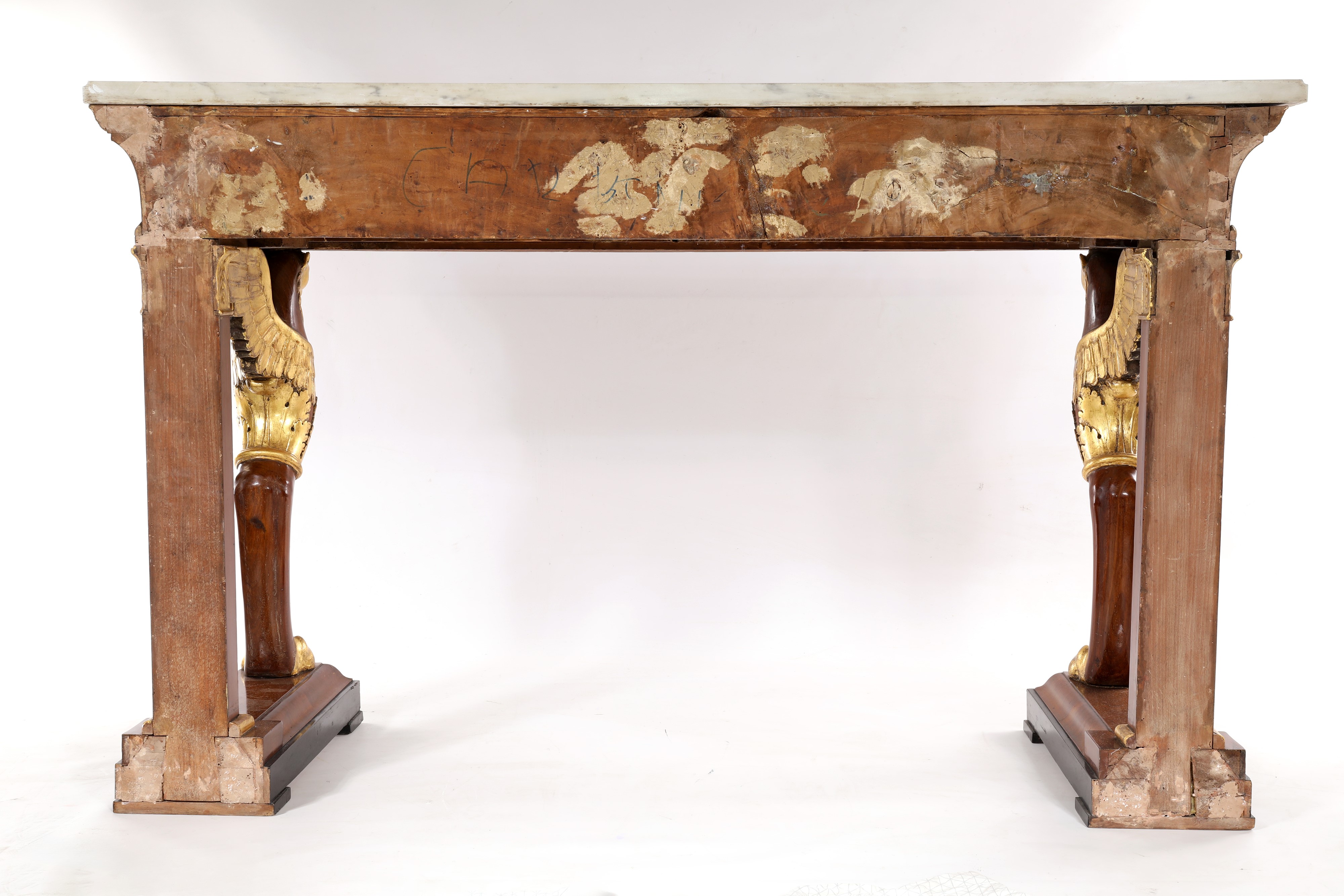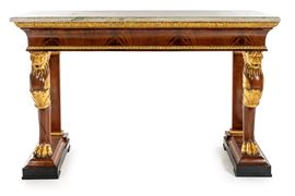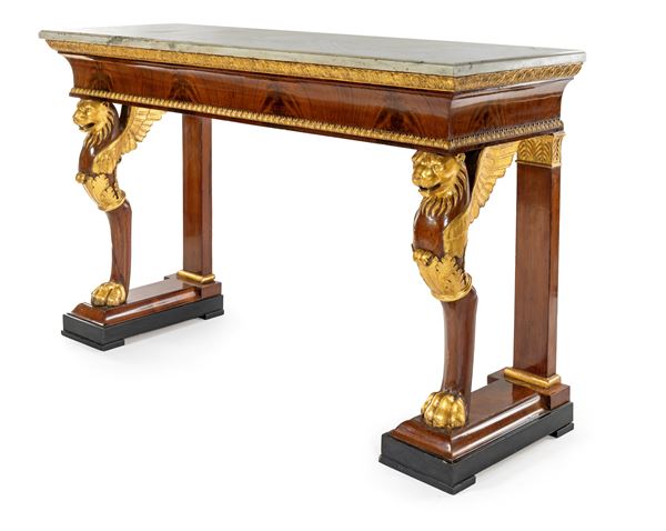 Console in piuma di mogano, dorata lungo i profili ed i rilievi ornamentali, XIX secolo