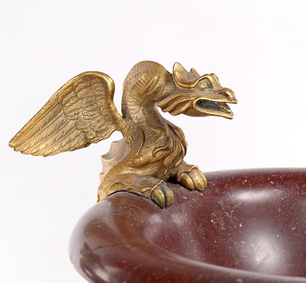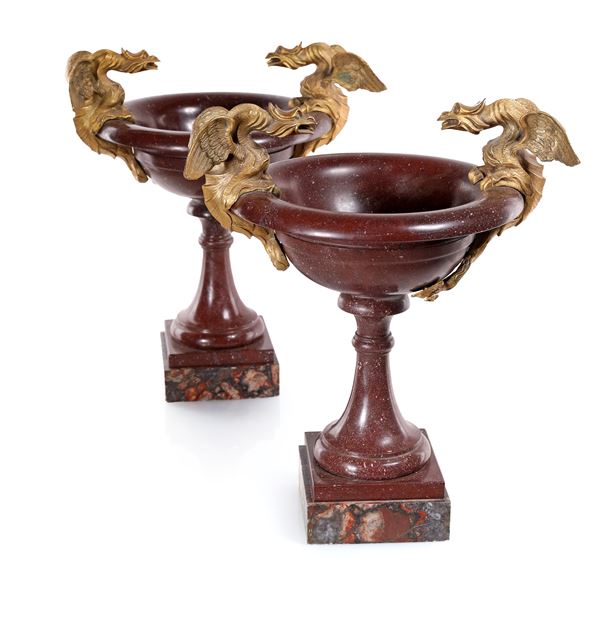 Coppia di coppe in porfido e marmo africano con grifoni fantastici in bronzo dorato, XIX secolo