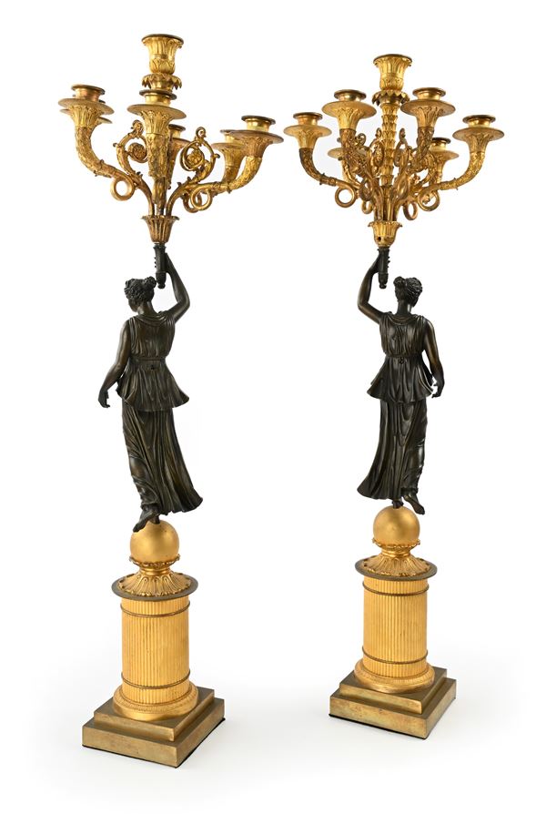 Coppia di flambeaux in bronzo dorato a sette luci, Francia, XIX secolo
