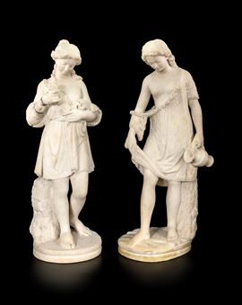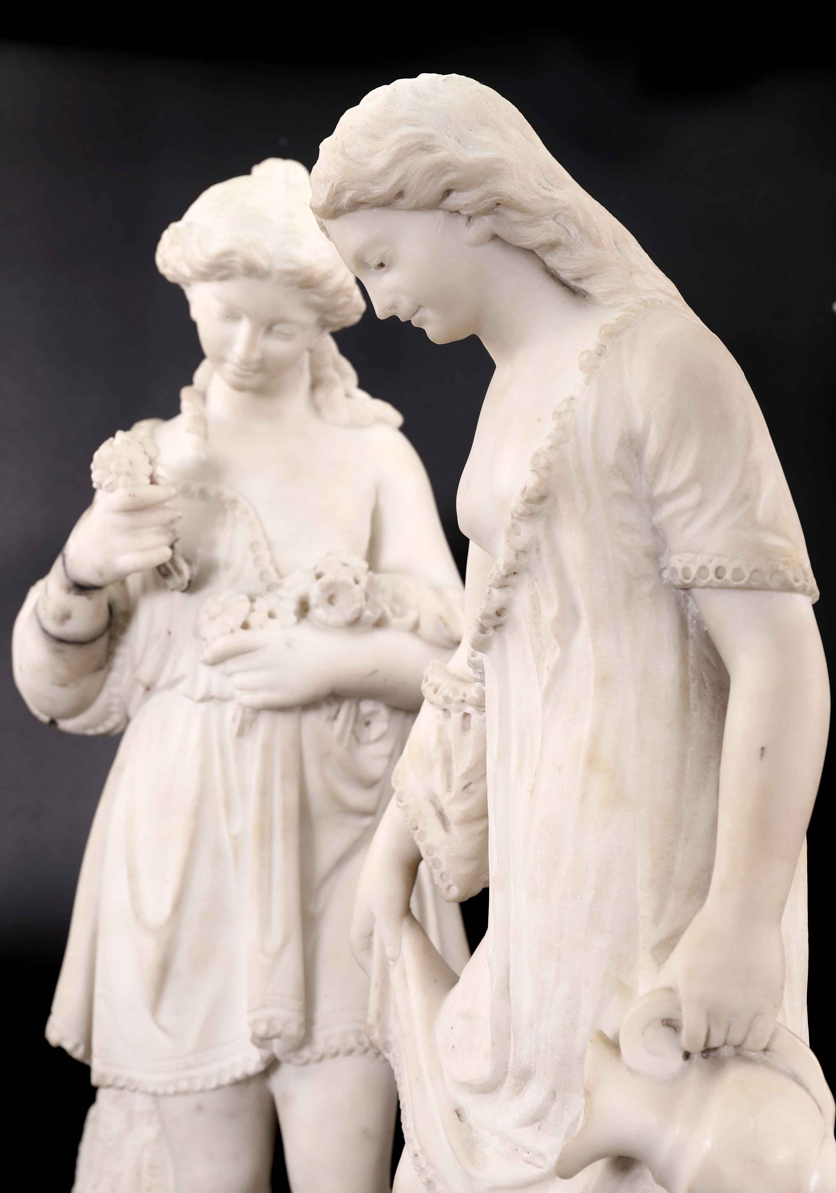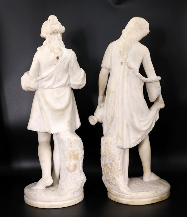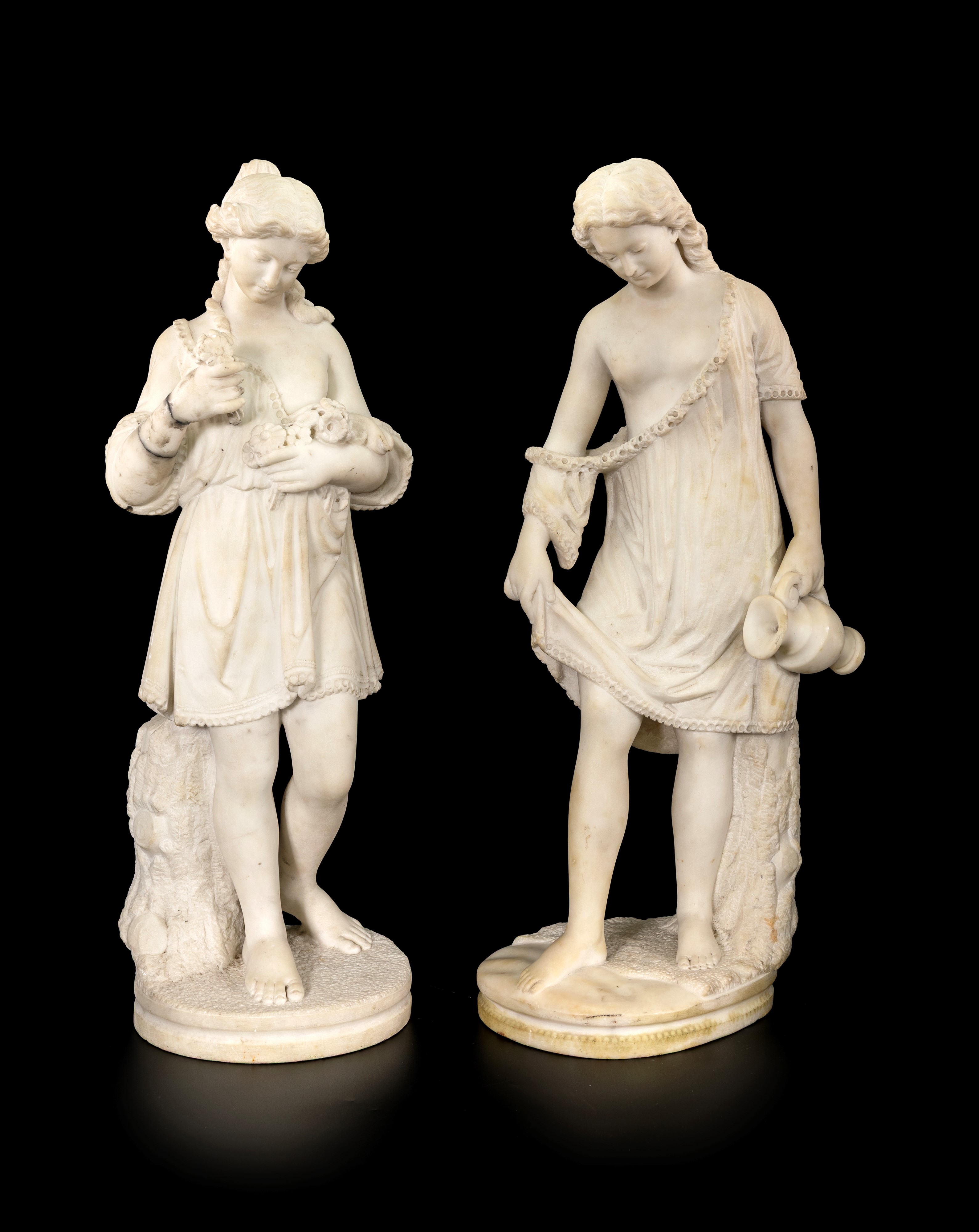 Coppia di sculture in marmo bianco raffiguranti Flora ed Ebe, inizi del XX secolo