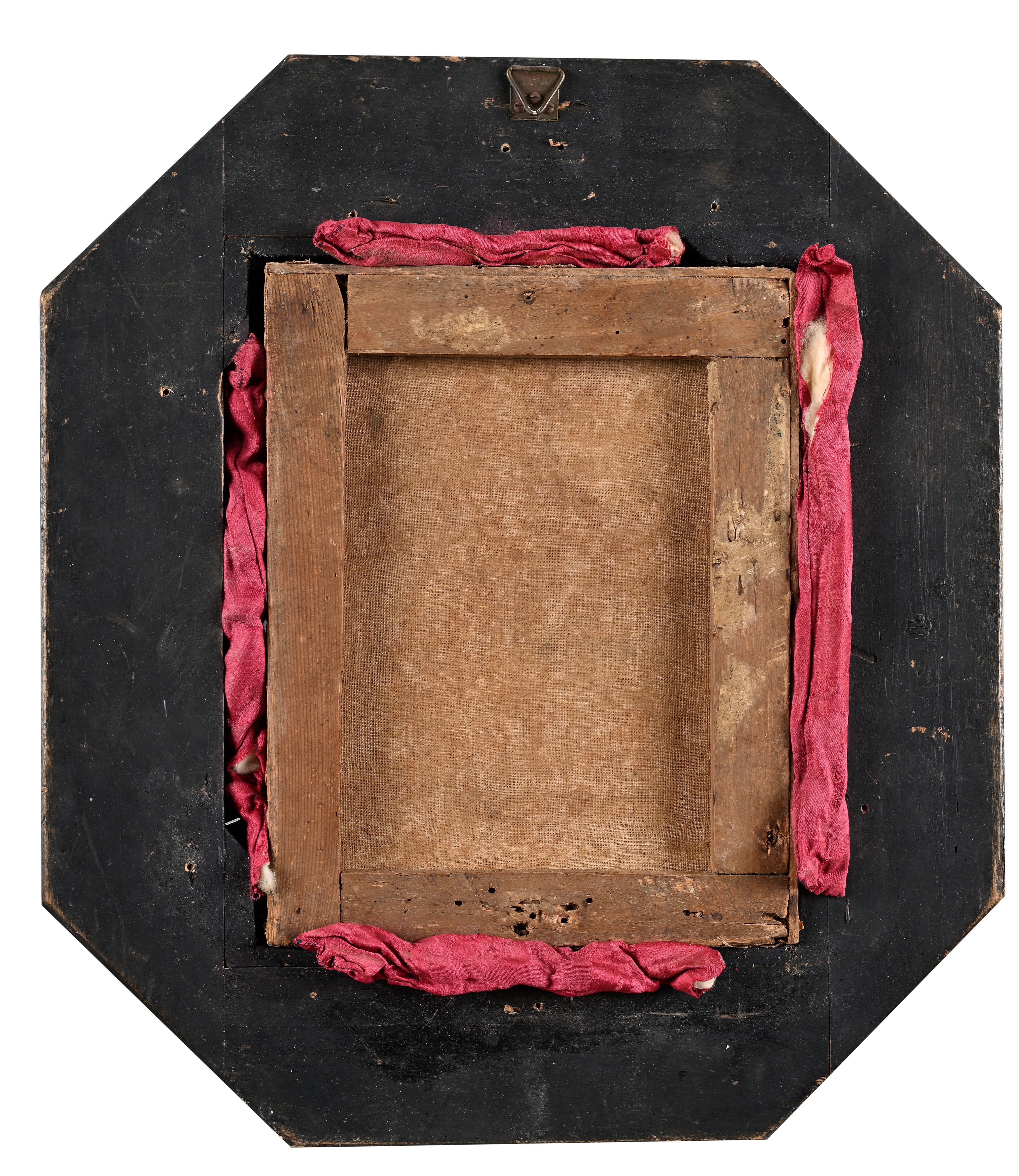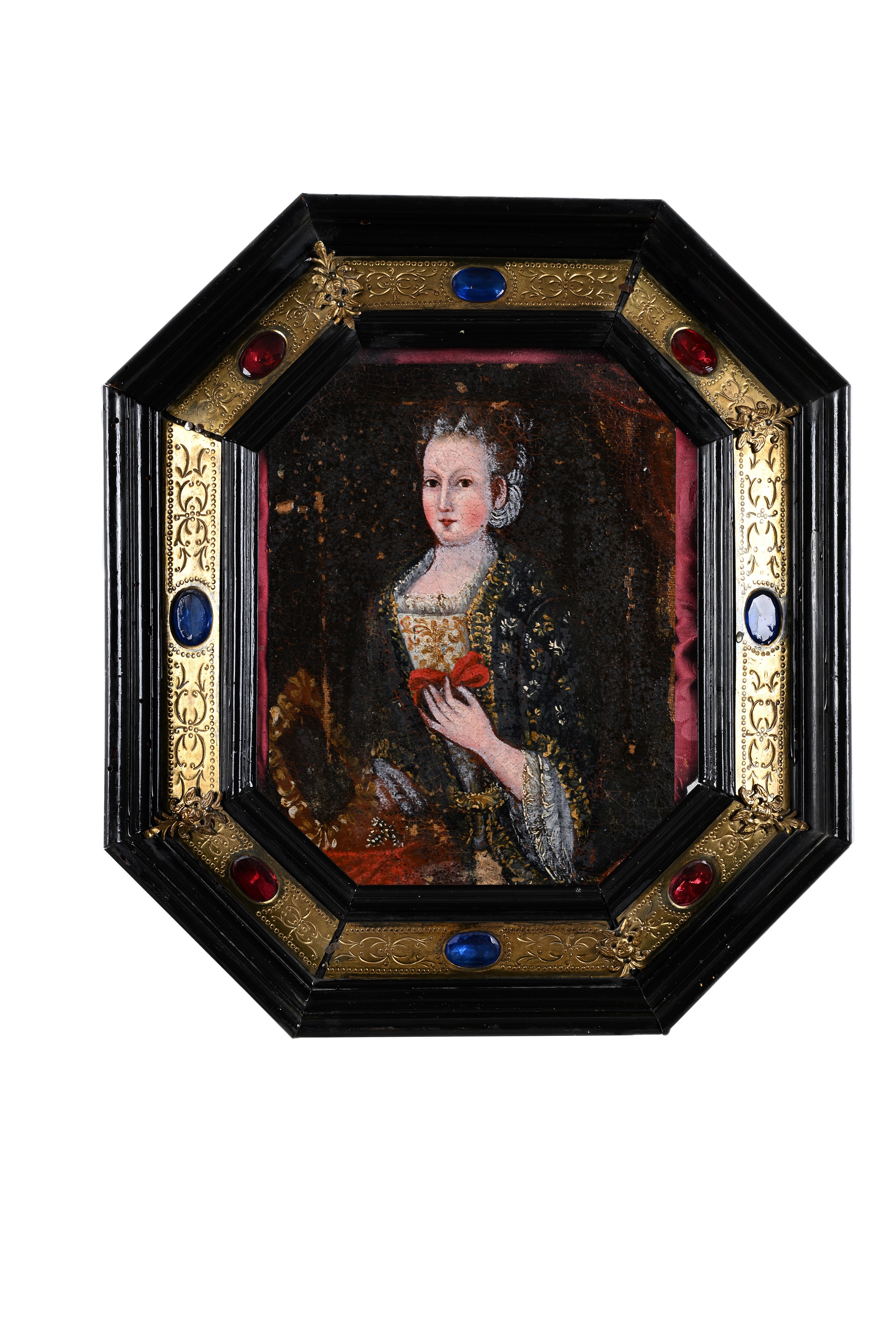 Cornice ottagonale in legno ebanizzato con finiture in rame dorato e gemme, XVIII secolo