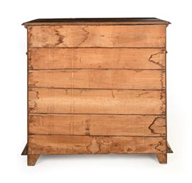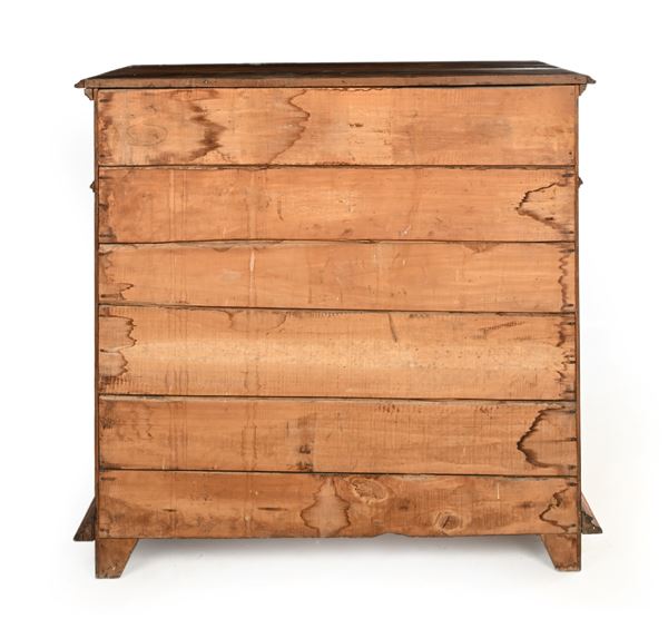 caratterizzata da bugnature geometriche, reca tre cassetti in linea nella fascia e due ante sottostanti; piedi a mensola
